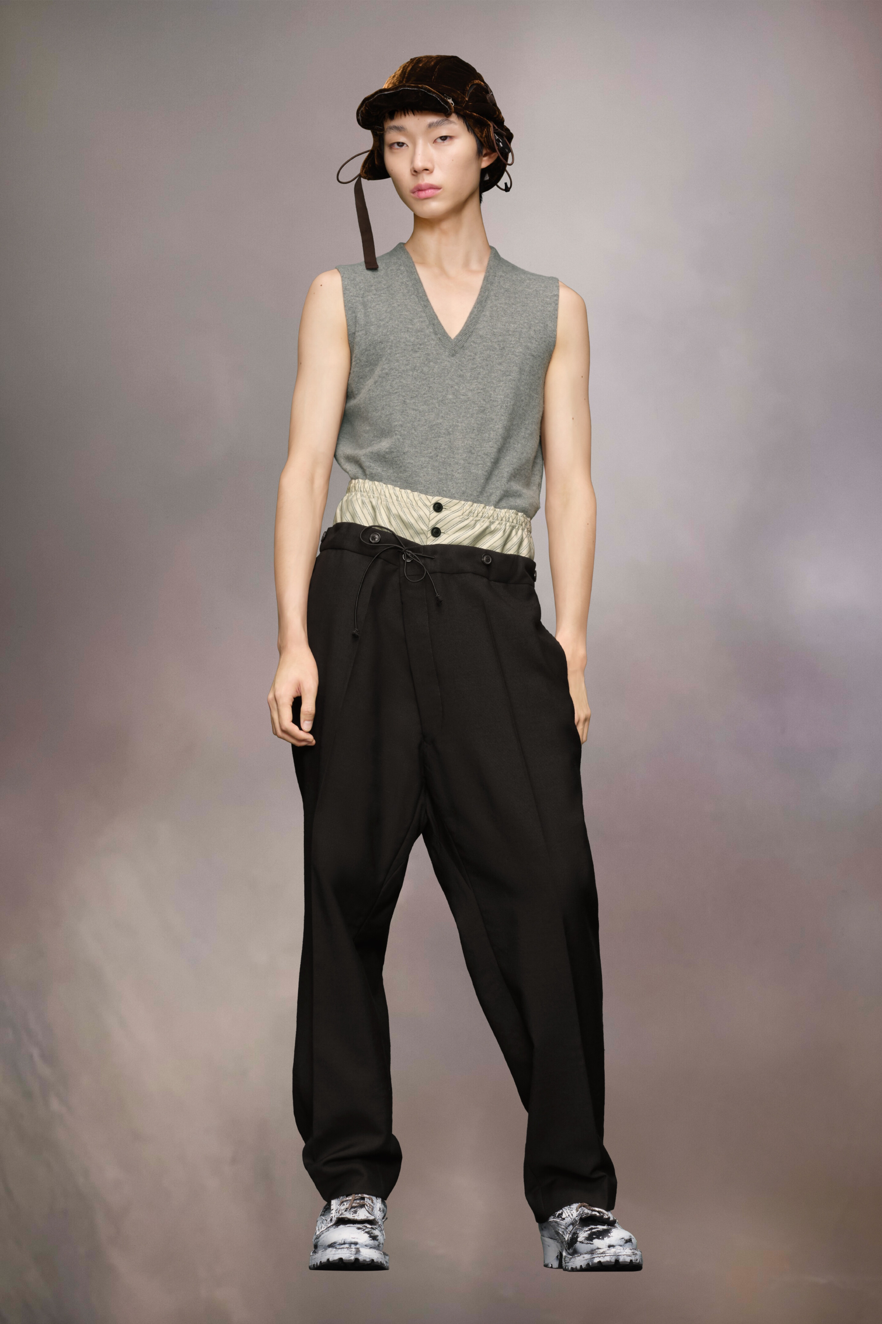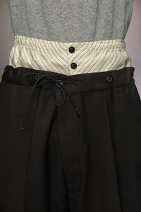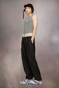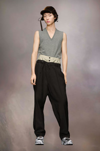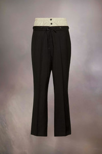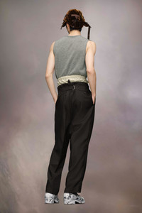 The mohair wool trousers explore the Maison’s Anonymity of the lining concept, with a high-waisted striped inner section reminiscent of traditional underwear. The plain trousers form a second layer and feature buttons around the waistband with a drawstring tie to close. With pleats and pockets, the trousers are also designed with a buckle at the back for an adjustable fit. Maison Margiela's signature, the four stitches, appear at the back; the opposite of a label. Product Details Item ID S50KA0658M35415900 Primary Fabric: 80% Wool 20% Mohair Secondary Fabric: 80% Cotton 20% Polyester Lining: 100% Cotton Lining: 100% Viscose-Rayon Pocket Lining: 100% Cotton Wool mohair trousers Two-layered waist with quilted inner layer with buttons and outer layer with a drawstring Dropped crotch Button fly under the inner waistband Straight-cut at the bottom Adjustable at the back Four stitches at the back Made in Italy Model is 188 cm tall and wears a size 46.