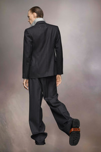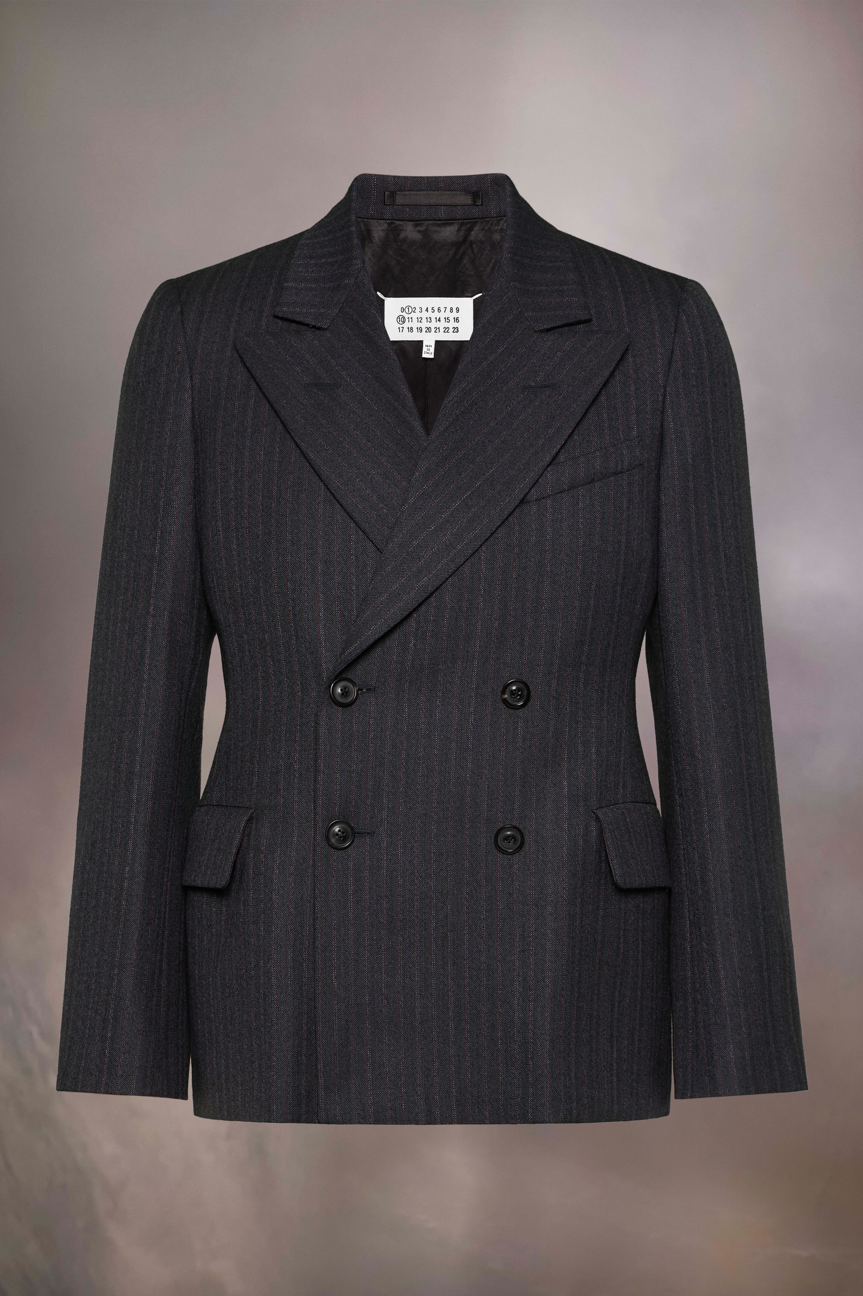 The blazer is crafted from barathea wool, featuring a peak lapel, flap pockets and a double-breasted design. The Maison's Work-in-progress stitches are seen at the cuffs for an unfinished aesthetic that offsets the classic tailoring. Maison Margiela's signature, the Four stitches, appear at the back; the opposite of a label. Product Details Item ID S50BN0527S60444001F Composition: 100% wool Lining: 67% wool 33% viscose-rayon Wool barathea suit jacket Peak lapel Double-breasted horn button closure Welt chest pocket Flap pockets Basting stitches on cuffs Single vent Four stitches at the back Made in Italy Model is 6'1" tall and wears a size 46.