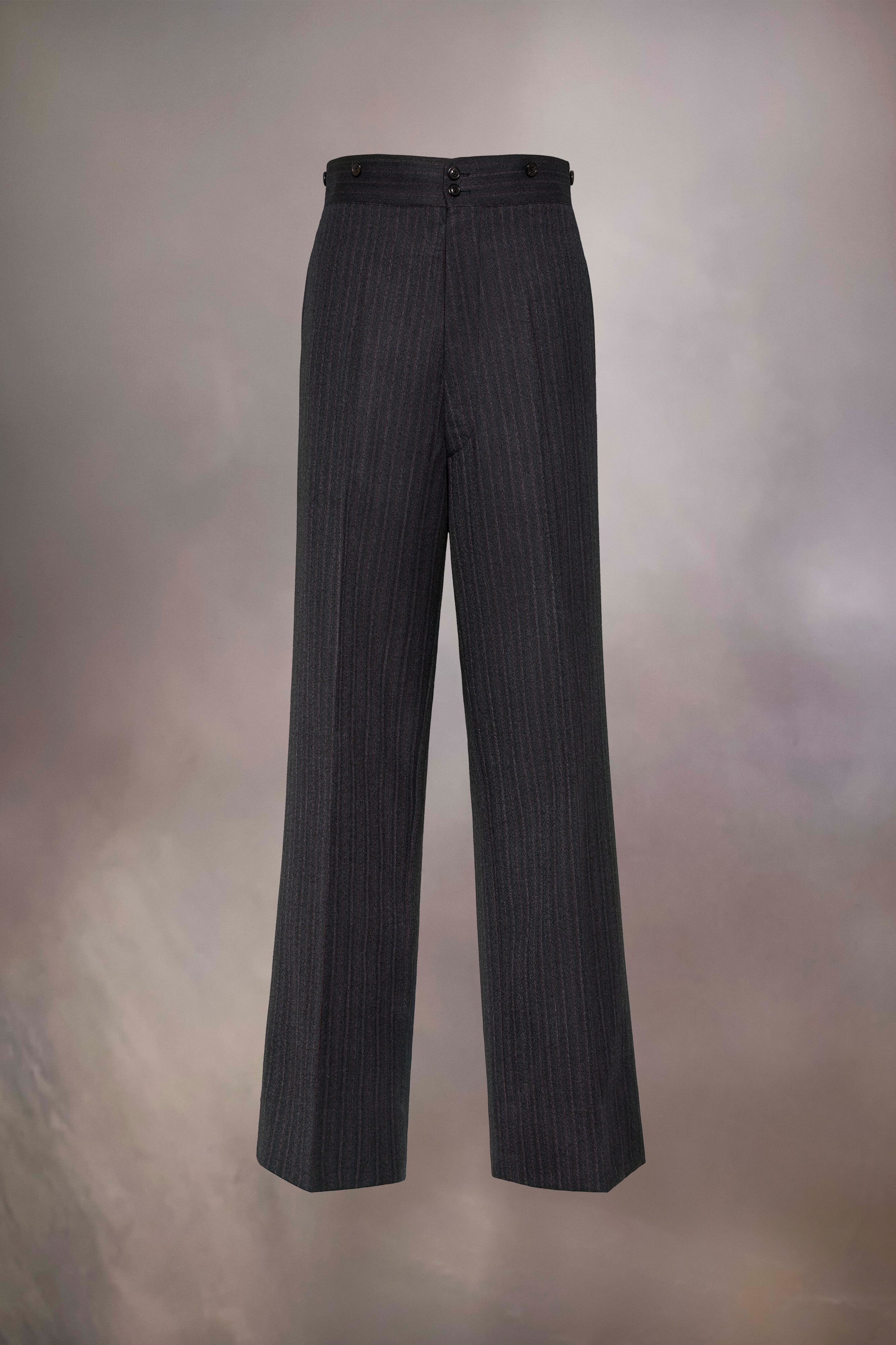 The wide-leg pleated trousers are crafted from barathea wool with the Margiela hook and buttons around the waist. They feature a buckle at the back for an adjustable fit. Maison Margiela's signature, the Four stitches, appear at the back; the opposite of a label. Product Details Item ID S50KA0654S60444001F Composition: 100% wool Lining: 80% cotton, 20% polyester Pocket lining: 100% cotton Wool barathea trousers High waist Wide leg Front pleats Horn button closure Maison Margiela hook Side pockets Adjustable at the back Four stitches at the back Made in Italy Model is 6'1" tall and wears a size 46.