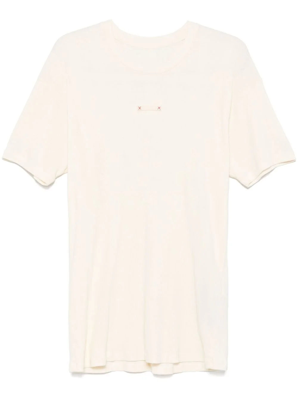 ribbed T-shirt Highlights - Light beige - Crew neck - Short sleeves - Signature four-stitch logo Made in Italy Composition Cotton 60%, Lyocell 40% SIZE & FIT Model measurements Height 6 ft 2 in(1.87 m) Bust/Chest 38.97 in(99 cm) Hips 37.99 in(96.5 cm) Waist 29.52 in(75 cm) FittingInformation Designed for a relaxed fit, this piece allows for comfort and movement when worn Made from a midweight non-stretch fabric, this piece offers minimal elasticity when worn