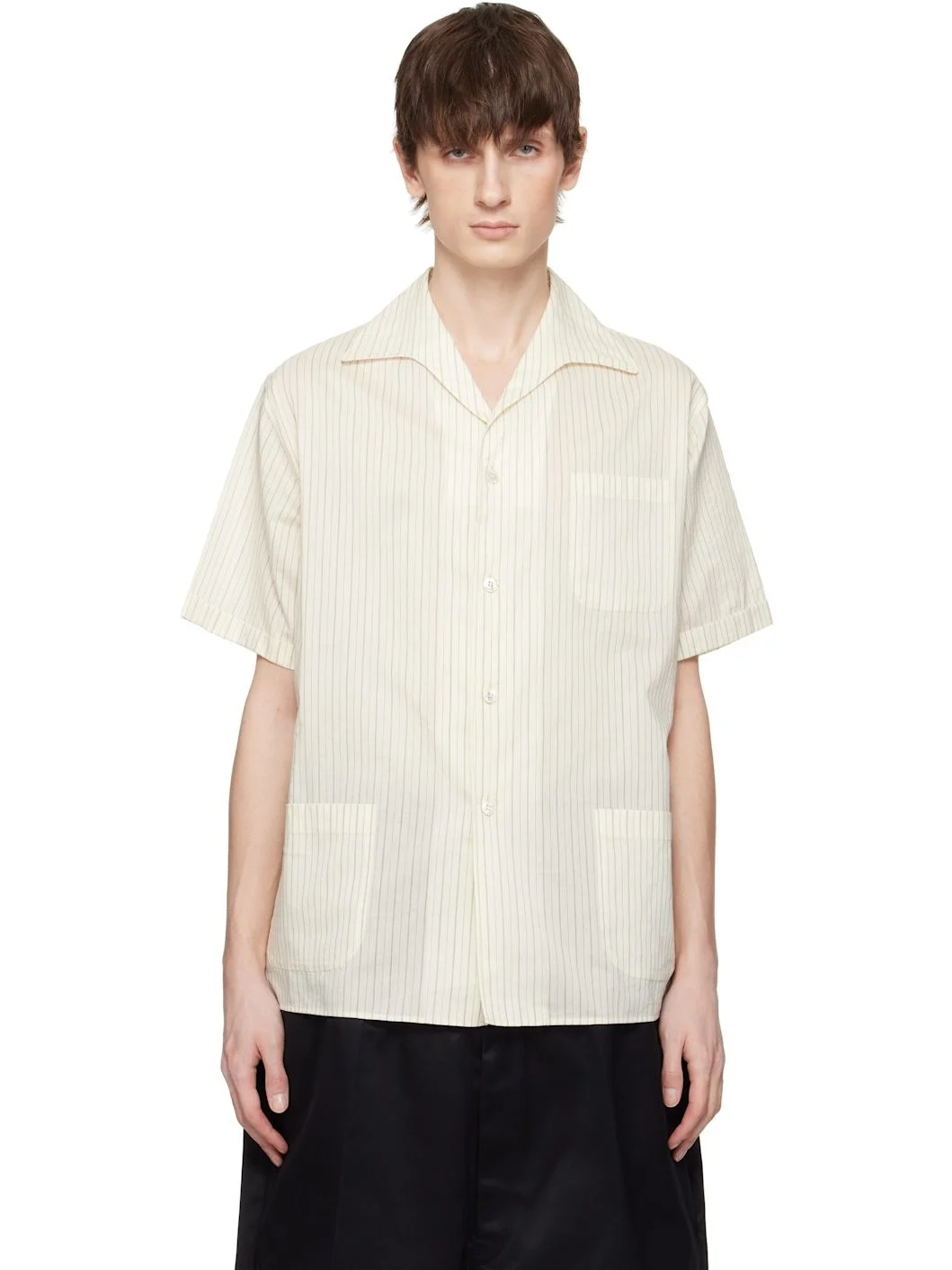 Plain-woven cotton- and silk-blend shirt. Stripes throughout. · Open spread collar · Button closure · Patch pocket · White stitching at back collar · Partial silk-blend satin lining Supplier color: Ecru 81% cotton, 19% silk. Made in Italy 251168M192012