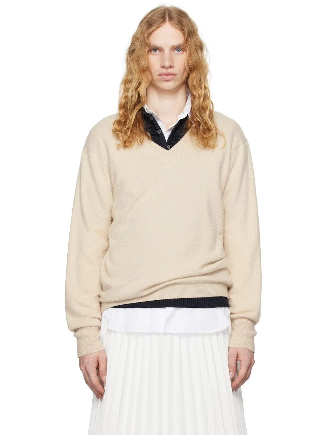 Knit slub cashmere- and cotton-blend sweater. · Rib-knit V-neck, hem, and cuffs · Dropped shoulders · White stitching at back Supplier color: Beige 78% cashmere, 22% cotton. Made in Italy 242168M206001