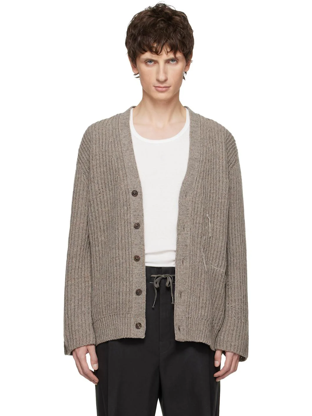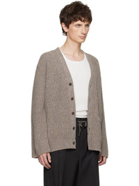 Rib-knit virgin wool- and cotton-blend cardigan. · Y-neck · Button closure · Loose threads at chest · Patch pocket at interior · White stitching at back collar Supplier color: Walnut 51% virgin wool, 47% cotton, 2% other fibres. Made in Italy 252168M200002