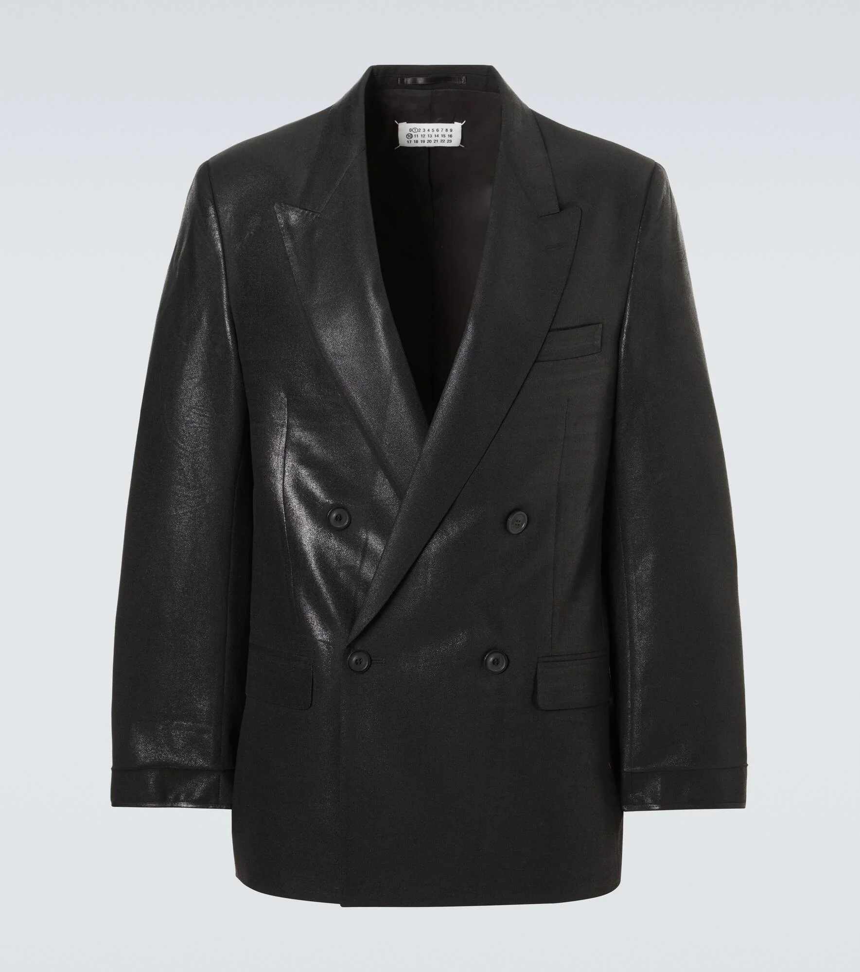Having shocked audiences with its radical runways and never-before-seen silhouettes in the late ‘80s, Maison Margiela continues to champion bold experimentation. Crafted from virgin wool using a unique pressed-and-foiled technique, this blazer comes in a double-breasted silhouette complete with front pockets. Product Details - Material: 100% virgin wool - Care instructions: dry clean - Made in Italy - Color: black - Designer color name: Black - Lining: 57% acetate, 43% viscose - Pocket lining: 100% cotton - Sleeve lining: 100% cupro - Peak lapel - Closure: double-breasted (four buttons) - Pockets: breast pocket, flap pockets, internal pockets - Cuff: four buttons - Item number: P01130792 Size & Fit - True to size - Shoulder pad inserts - Straight fit - Non-stretchy fabric - Falls below the hip - The model in the picture is 185cm-6'1" and wearing a size IT 50