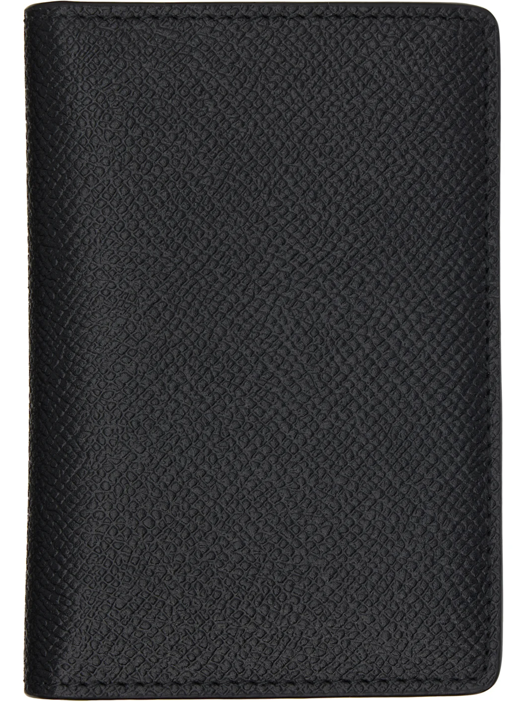 Pebble-grained calfskin bifold card holder. · White stitching at back face · Five card slots and two patch pockets at interior · H4.25" x W3" x D0.5" Supplier color: Black Calfskin. Made in Italy 261168M163020