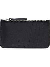 Pebble-grained and buffed calfskin card holder. · White stitching at face · Four card slots at back face · Zip closure · Canvas lining · H2" x W5" Supplier color: Black Calfskin. Made in Italy 252168M163008
