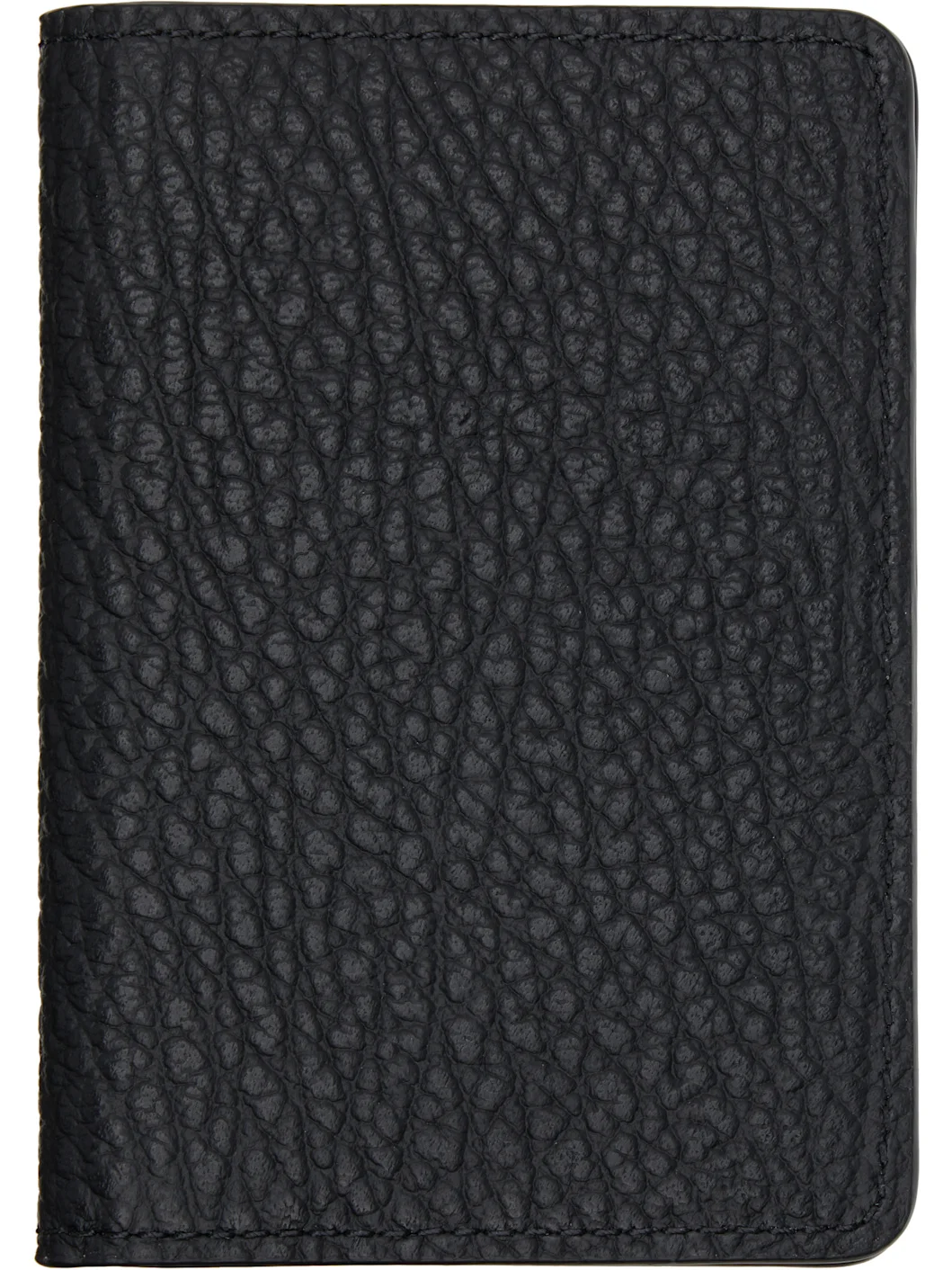 Grained calfskin bifold card holder. · White stitching at back face · Five card slots and two patch pockets at interior · H4.5" x W3" x D0.25" Supplier color: Black Calfskin. Made in Italy 261168M163011