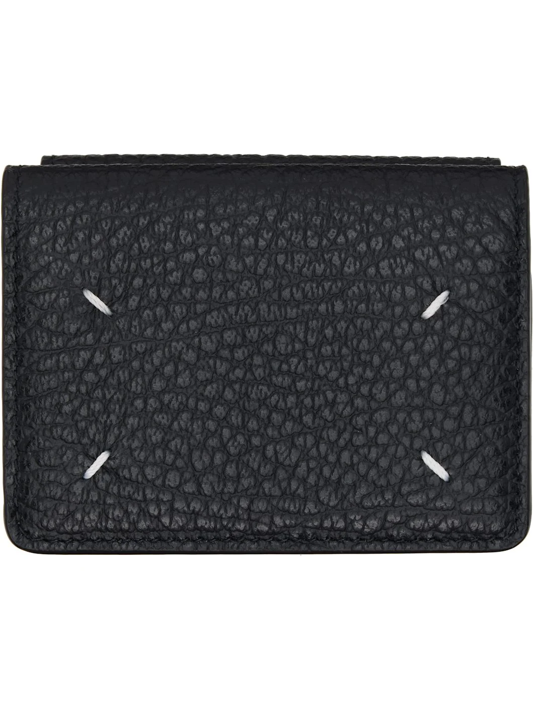 Grained calfskin trifold wallet. · White stitching at face · Press-stud coin compartment at back face · Press-stud closure · Two card slots at interior · One note slot · H4" x W3" x D1.25" Supplier color: Black Calfskin. Made in Italy 261168M164016