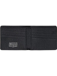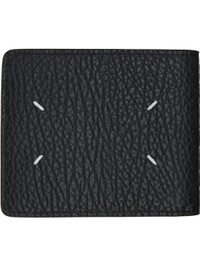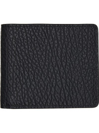Grained calfskin bifold wallet. · White stitching at back face · Eight card slots and two patch pockets at interior · Two note slots · H3.75" x W4.5" x D0.5" Supplier color: Black Calfskin. Made in Italy 261168M164010