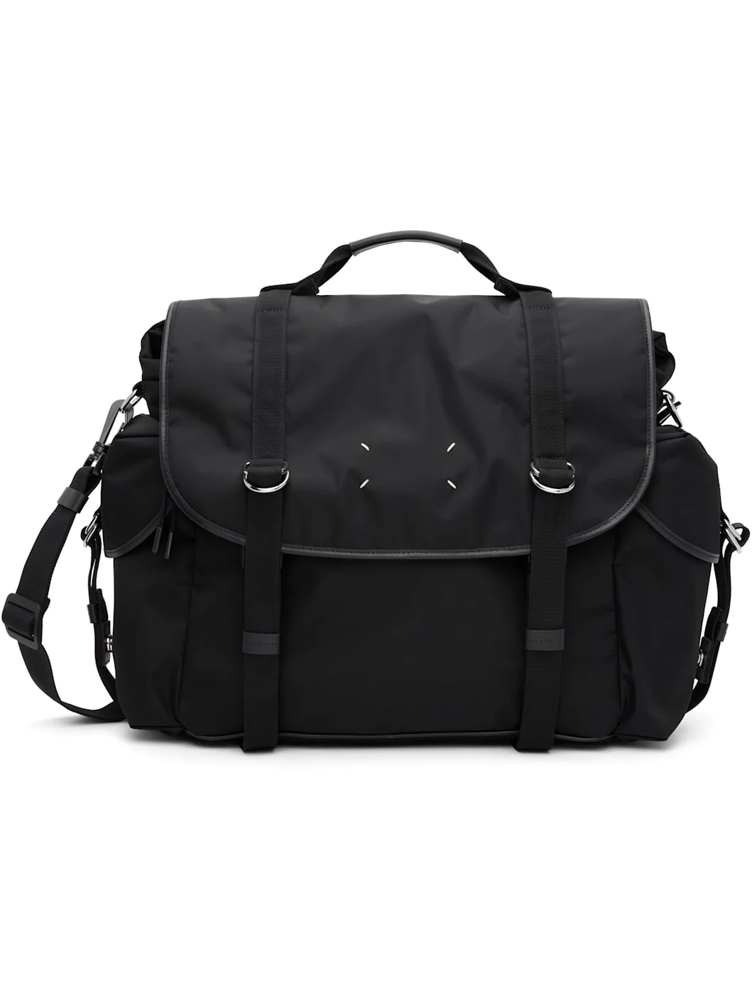 Nylon twill messenger bag. · Fixed carry handle · Adjustable and detachable crossbody strap · White stitching and concealed zip pocket at face · Bumper studs at base · Flap pocket and cinch strap at sides · Zip pocket and ID window at back face · Padded mesh panel at back face · Press-release flap · Drawstring closure · Patch pocket at interior · H13" x W19" x D6.5" Supplier color: Black Textile. Made in Italy 261168M170008