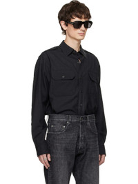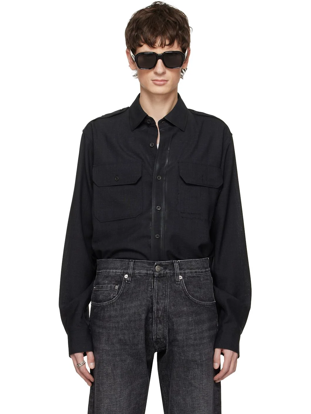 Plain-woven wool shirt. · Spread collar · Button closure · Flap pockets at chest · Shirttail hem · Epaulets · Buttoned barrel cuffs · White stitching at back Supplier color: Charcoal Body: 100% wool. Lining: 100% viscose. Made in Italy 252168M192004