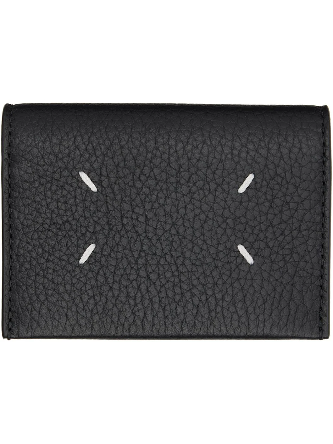 Grained calfskin bifold card holder. · Logo stamp at face · White stitching at face and back face · Four card slots at interior · Buffed goatskin and goatskin suede lining · H3" x W4" x D0.75" Supplier color: Black/Black/Black Calfskin. Made in Italy 252168M163004