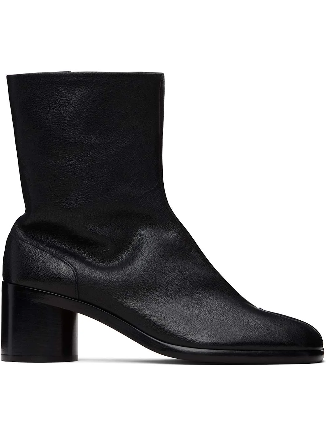 Ankle-high grained calfskin boots. · Square cleft toe · Concealed hook-eye closure at inner side · White stitch at heel collar · Buffed leather lining · Stacked cylindrical block heel with rubber injection · Calfskin sole · Heel: H2.5" Supplier color: Black Calfskin. Made in Italy 261168M228003