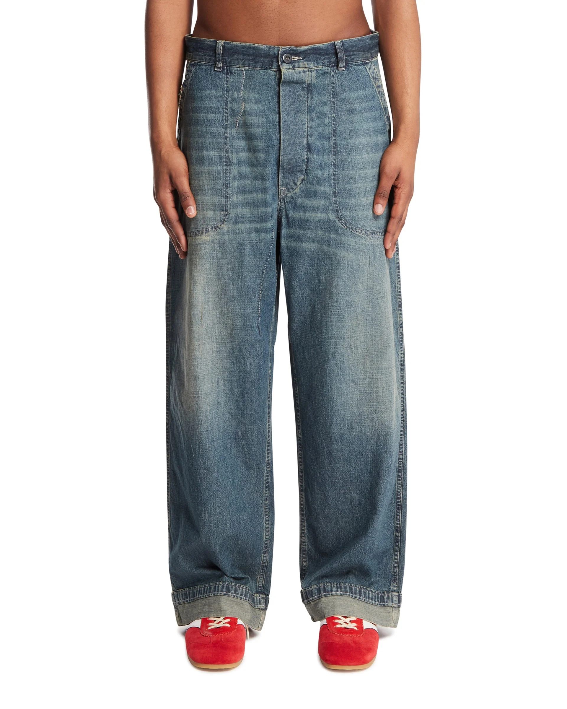 Maison Margiela Blue Wide-Leg Jeans. Blue cotton denim with visible stitching and turned-up hem, regular waist, front button and zip closure, iconic Four Stitches on the back, relaxed fit. Giovanni is 188 cm and he is wearing size 48. DETAILS Model: S50KA0710M30021962 Composition: 100% Cotton Made in: ITALY Season: SS26
