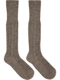 Pair of knee-high cable-knit virgin wool socks. Signature white stitching at rib knit cuff. Supplier color: Light brown 100% virgin wool. Made in Italy 252168M220002