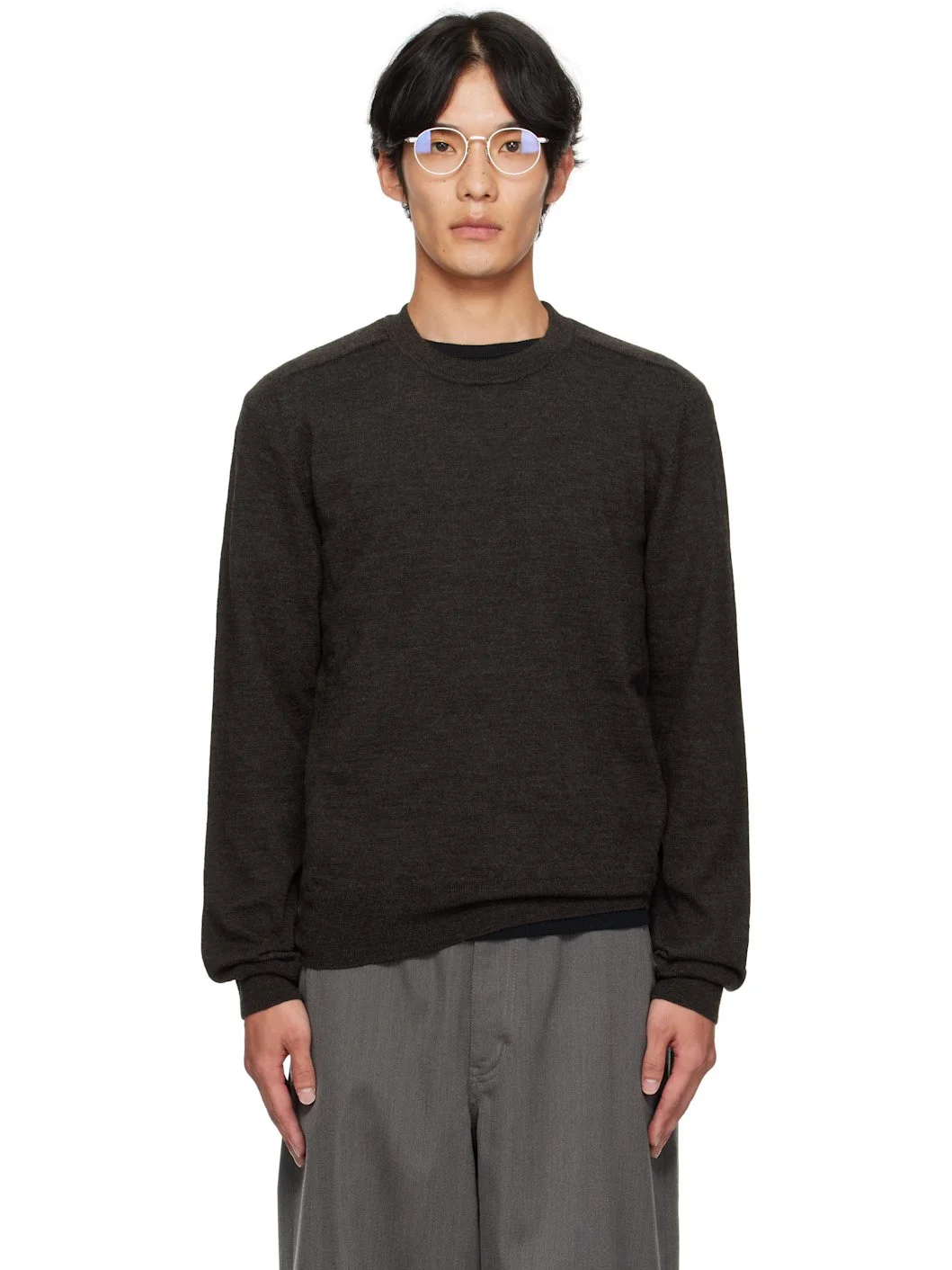 Knit wool sweater. · Rib-knit crewneck, hem, and cuffs · Suede elbow patches · White stitching at back collar Supplier color: Dark brown 100% wool. Made in Romania 252168M201006