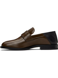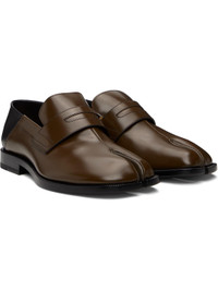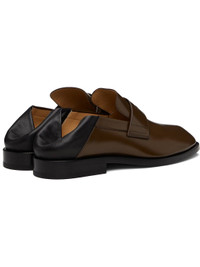 Buffed calfskin loafers. · Square cleft toe · Strap with cutout at vamp · White stitching at heel collar · Collapsible heel counter · Serrated edge at welt · Stacked leather heel with rubber injection · Calfskin sole Supplier color: Wood Upper: calfskin. Sole: calfskin, rubber. Made in Italy 252168M231009