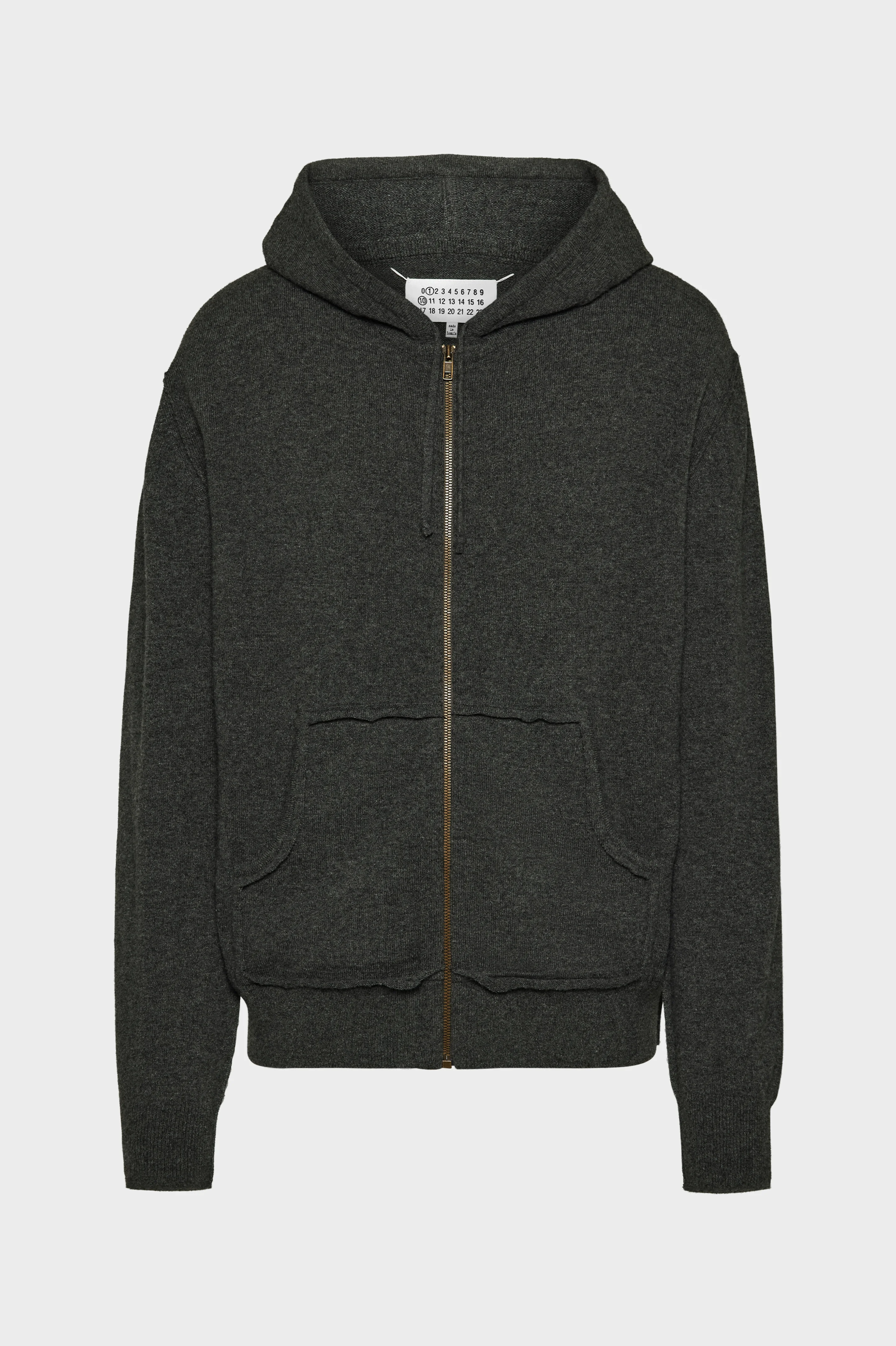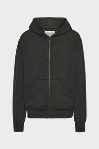 Crafted from a soft cashmere wool bend, the loungewear zip-through hoodie features a Decortique front pocket, adding texture and volume to the front of the sweater. It is designed with dropped shoulder seams for a relaxed take, ribbed trims and a drawstring at the neck. Maison Margiela's signature, the four stitches, appear at the back; the opposite of a label. Product Details Item ID S50GU0234M13095859M Primary Fabric: 70% Wool 30% Cashmere Midweight wool cashmere blend crewneck Gauge 12 Zip closure Adjustable drawstring hood Decortique kangaroo pocket with visible seams Ribbed trims Four stitches at the back Model is 185 cm tall and wears a size S.