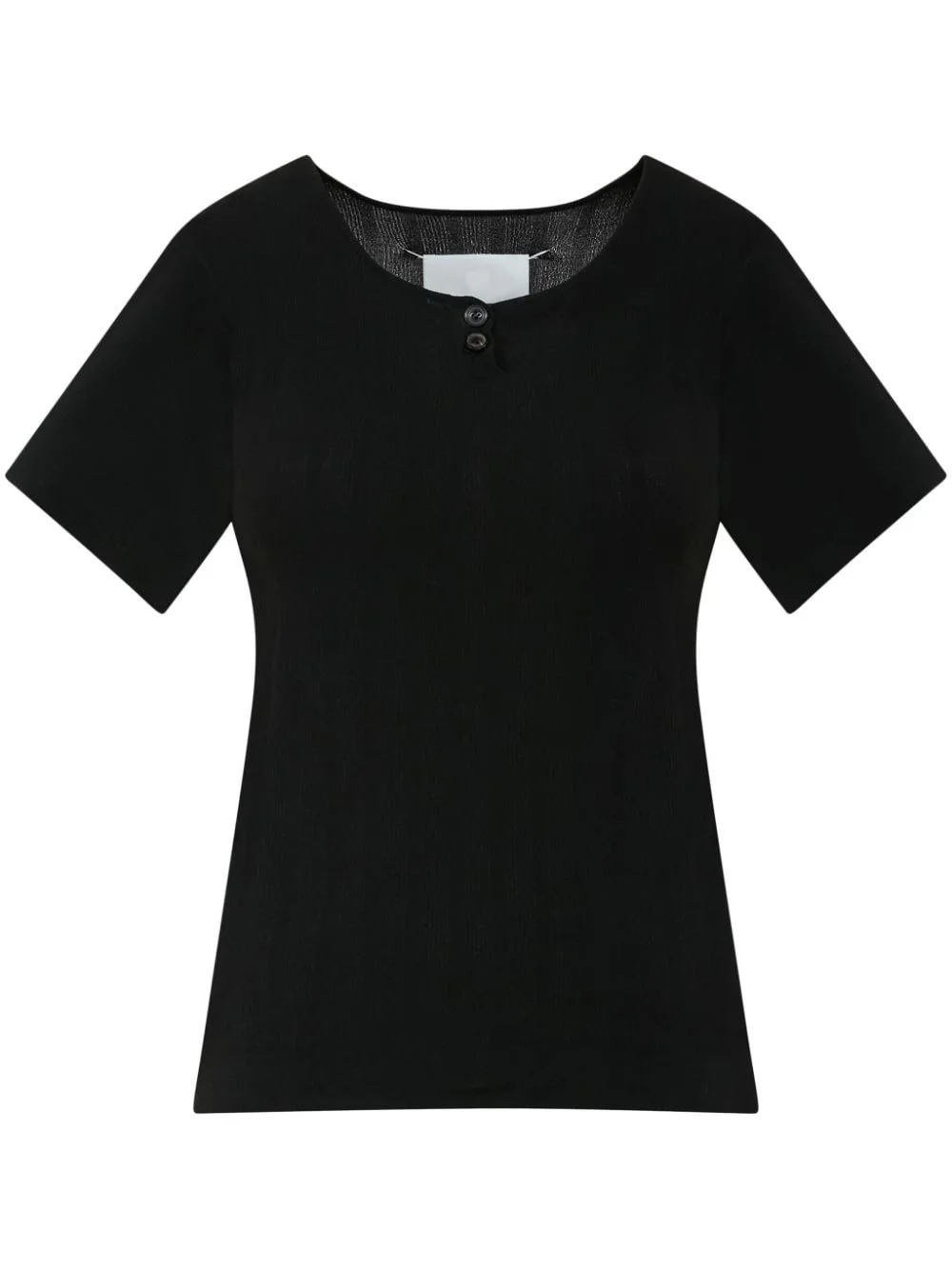 button-placket T-shirt Maison Margiela's innovative yet minimalist design style is reflected in this short-sleeve T-shirt which is made from stretch cotton and features a two-button placket at the neckline. Highlights - Black - Stretch-design - Round neck - Front button placket - Short sleeves - Straight hem Made in Italy Composition Polyamide 88%, Spandex/Elastane 12% Washing instructions Read Manufacturer Guidelines