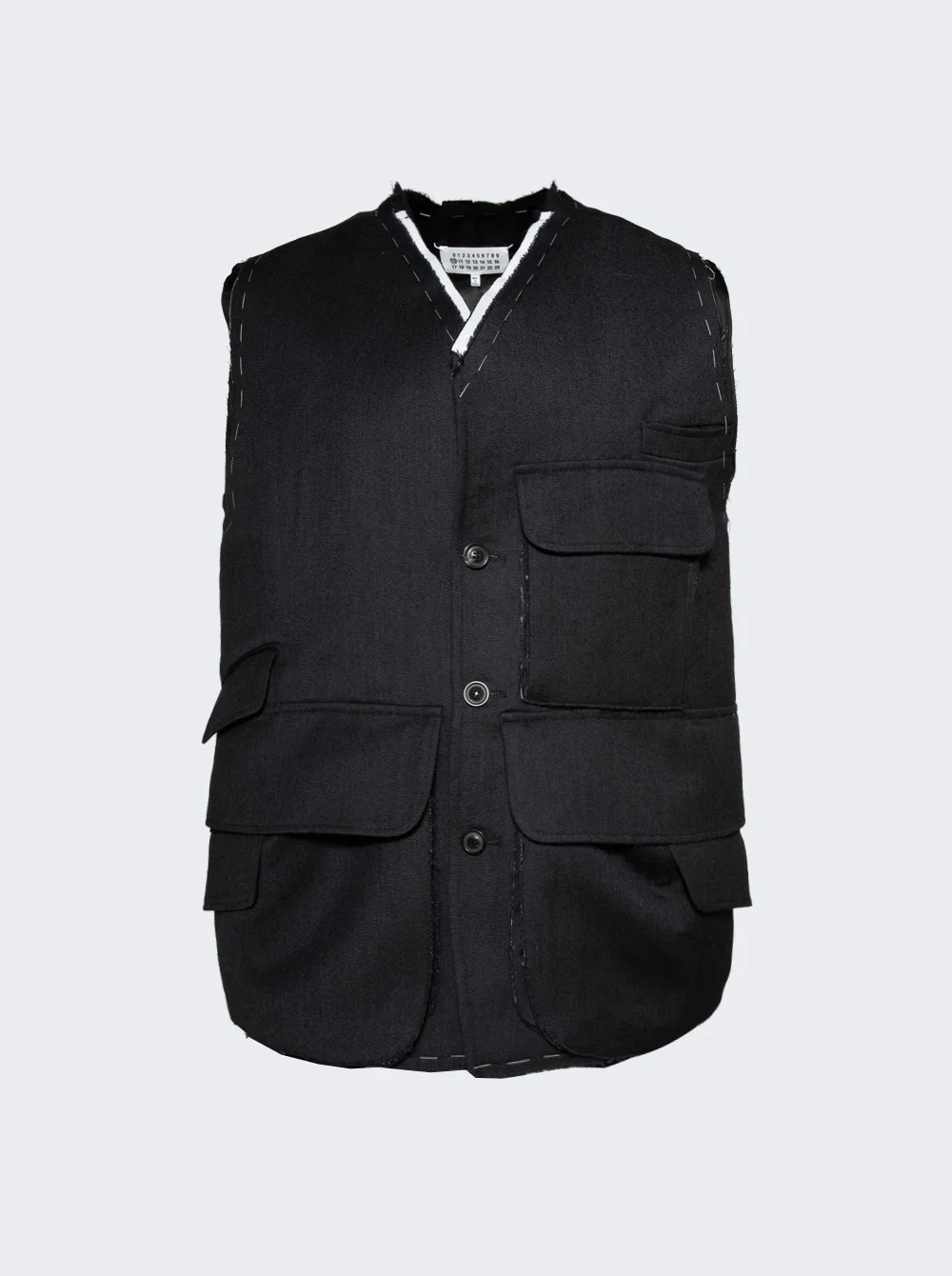 Details - Vest in wool suiting fabric - Exposed stitches - Utility pockets - V-neck - Button closure Brand Style: S50FB0109 S44578 Designer/Brand: MAISON MARGIELA