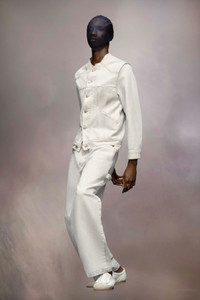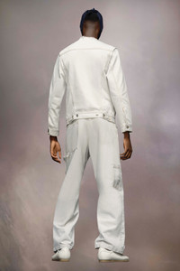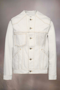 In chalk selvedge denim with a raw-edge crew-neck, the collarless jacket features a yoke and multiple pockets, with buttons down the front, at the cuffs and on the waistband on the back. Maison Margiela's signature, the four stitches, appear at the back; the opposite of a label. Product Details Item ID S50AM0587S30857961 The model is 6'1" tall and wears size 46.