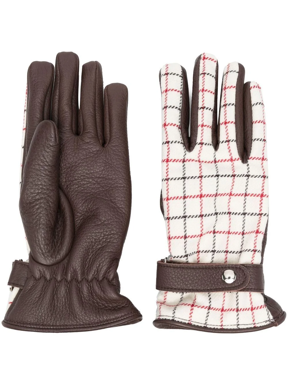 Checked Leather Gloves in Tan from Maison Margiela Highlights - brown leather - checkered fabric - cashmere lining - snap button fastening Made in Italy Composition: Outer is 100% Deer Skin and 100% Wool, Lining is 100% Cashmere Designer ID: SI1TS0001SY1570 Color ID: 138