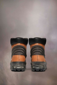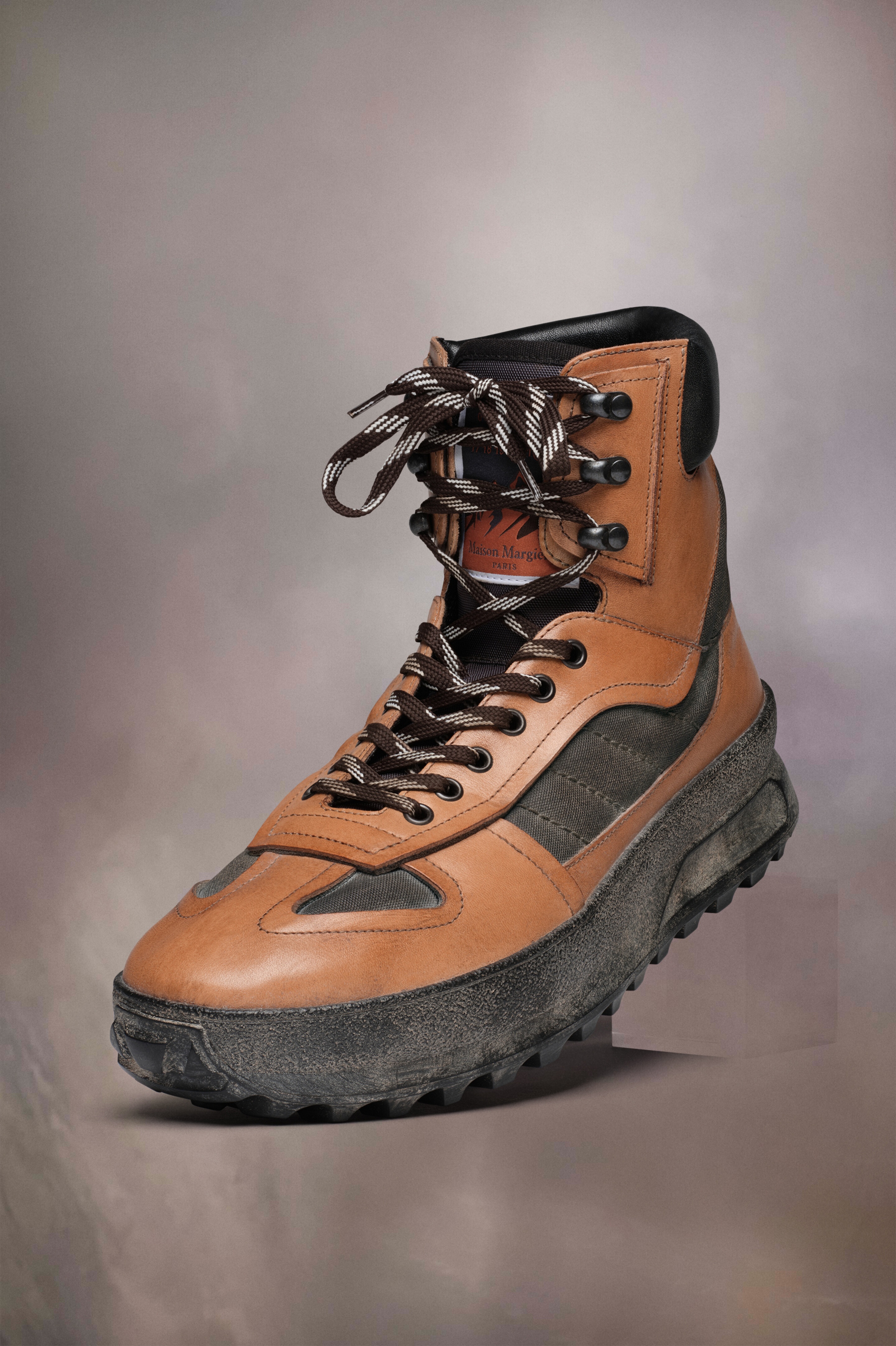 The high-top climber sneakers come in leather and nylon with a sunburned effect. The front shape mimics that of the Maison's Replica style. They feature the numeric logo on the cleated sole, and a decorative logo tongue, with décortiqué details. The back features a single white stitch showing the hand of Maison Margiela. Product Details Item ID S57WS0475PR215H8907 Upper: 100% calf leather Contrast: 100% calf leather Lining: 100% polyester Inside: 100% calf leather Sole: 100% polyurethane Leather climber sneakers Eye row closure for fine-tuned lacing Cleated sole Vintage treatment White stitching and number logo at the back Made in Italy A digital certificate provided by the Aura Blockchain Consortium guarantees the authenticity of this product. Discover more on auraluxuryblockchain.com/#about