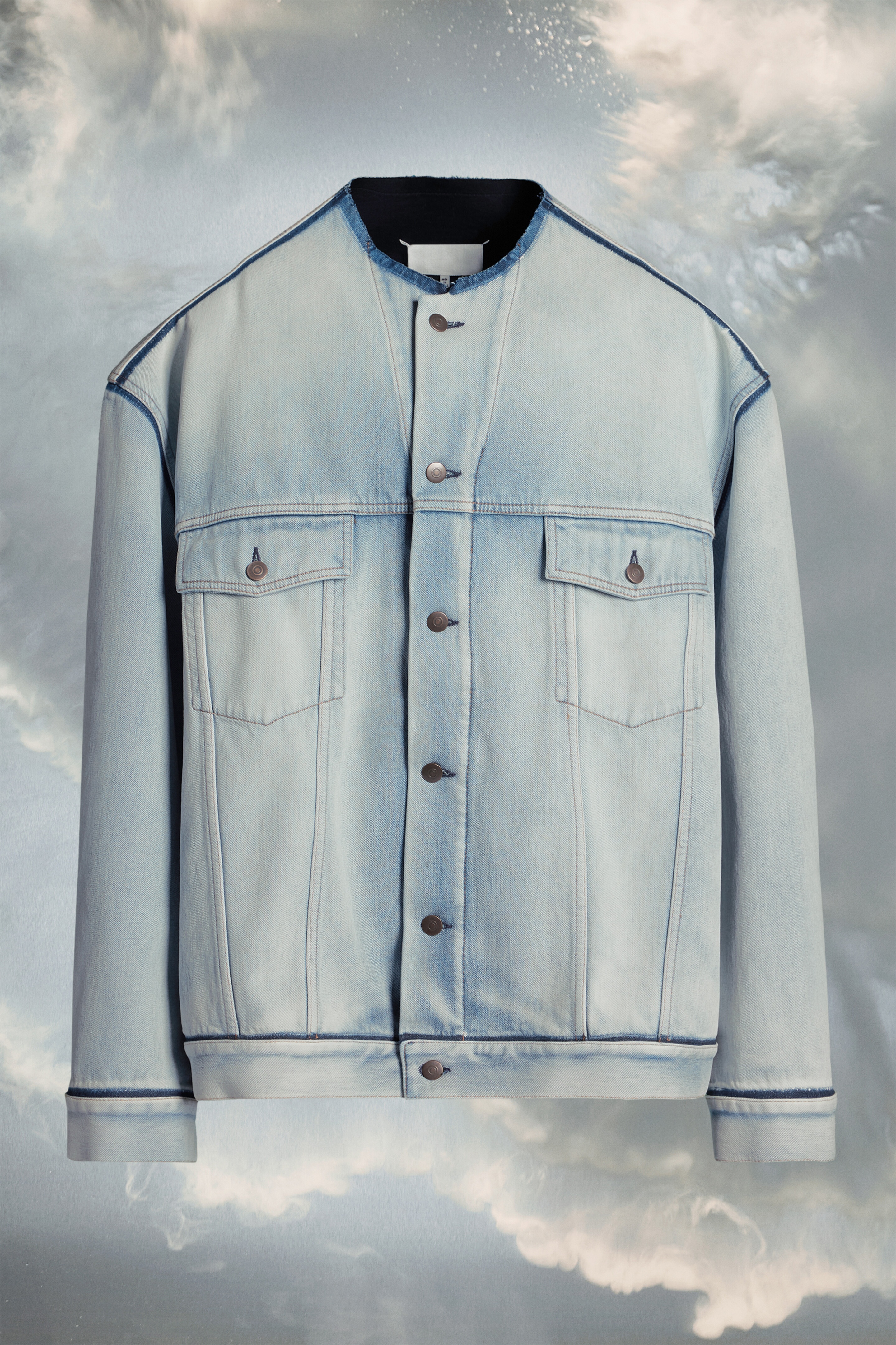 Bonded denim with an icy wash, the collarless jacket features buttoned chest pockets and buttoned cuffs and hem. It comes with dropped shoulder seams for a relaxed silhouette. Maison Margiela’s signature, the Four stitches, appear at the back; the opposite of a label. Product Details Item ID S67AM0067S30874961 COED Fall Winter 2023 Composition: 100% Cotton Bonded icy wash jacket Collarless Dropped shoulder Flap pockets Four stitchesat the back Made in Italy Oversized fit