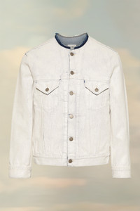 This fitted collarless denim jacket has a cracked white effect and features classic metal hardware and seam detailing. The contrast neck has a raw finish and the back shows the four white stitches, showing the hand of the Maison: the opposite of a label. Product Details Item ID SI1AM0007S30561967 Composition: 100% Cotton Handpainted coating Décortiqué lasered details Collarless Button closure Two button closure flap pockets Button closure cuffs Four stitches at the back Made in Italy The model is 5'10" tall and wears size 46.