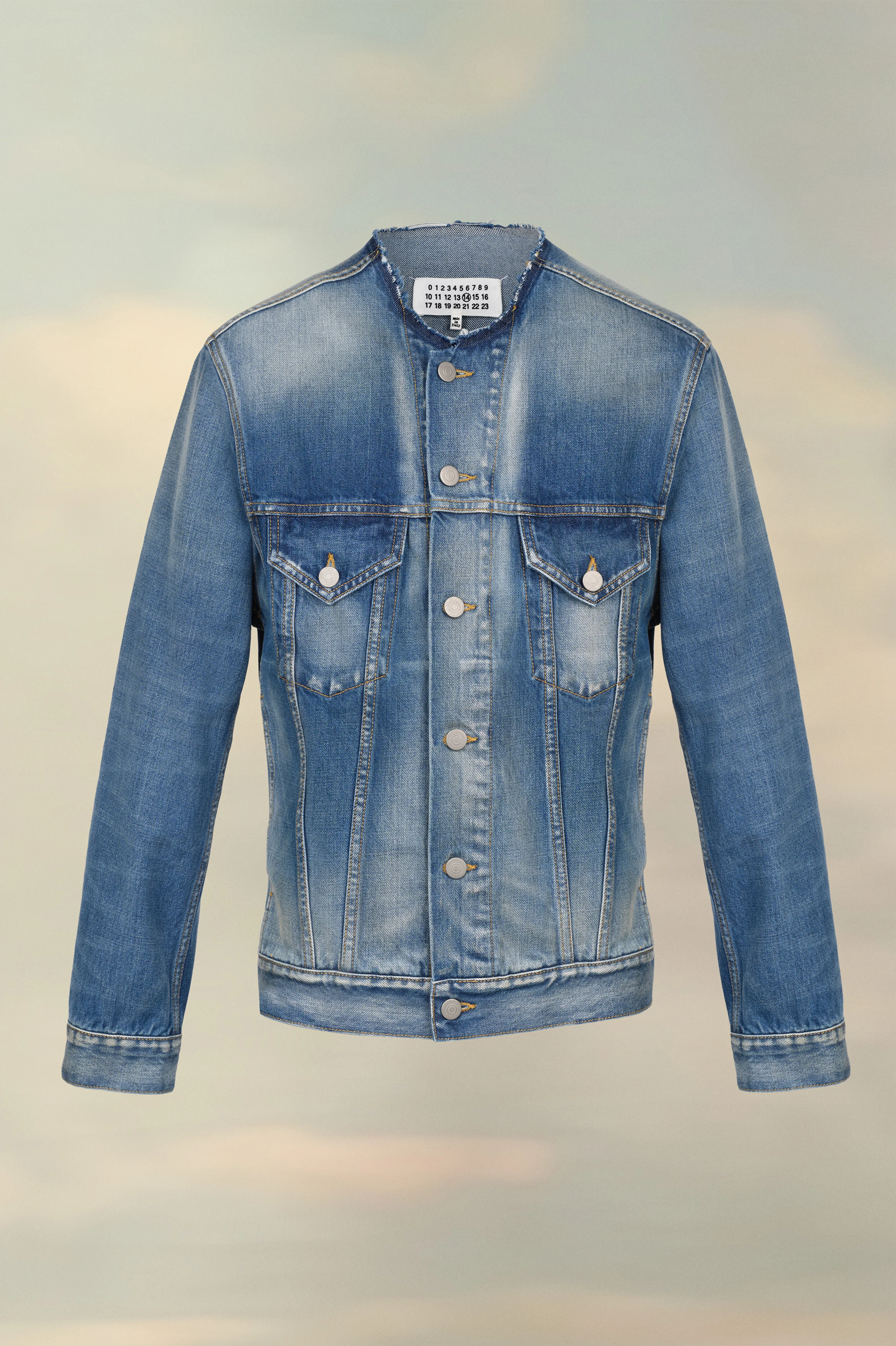 The denim jacket has two chest pockets, metal buttons and exposed seams. It features a collarless silhouette with a raw edge. Product Details Item ID SI1AM0006S30561966 Composition: 100% Cotton Décortiqué details Collarless Contrasting seams Button closure Two button closure flap pockets Button closure cuffs Four stitches at the back Made in Italy