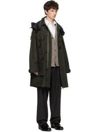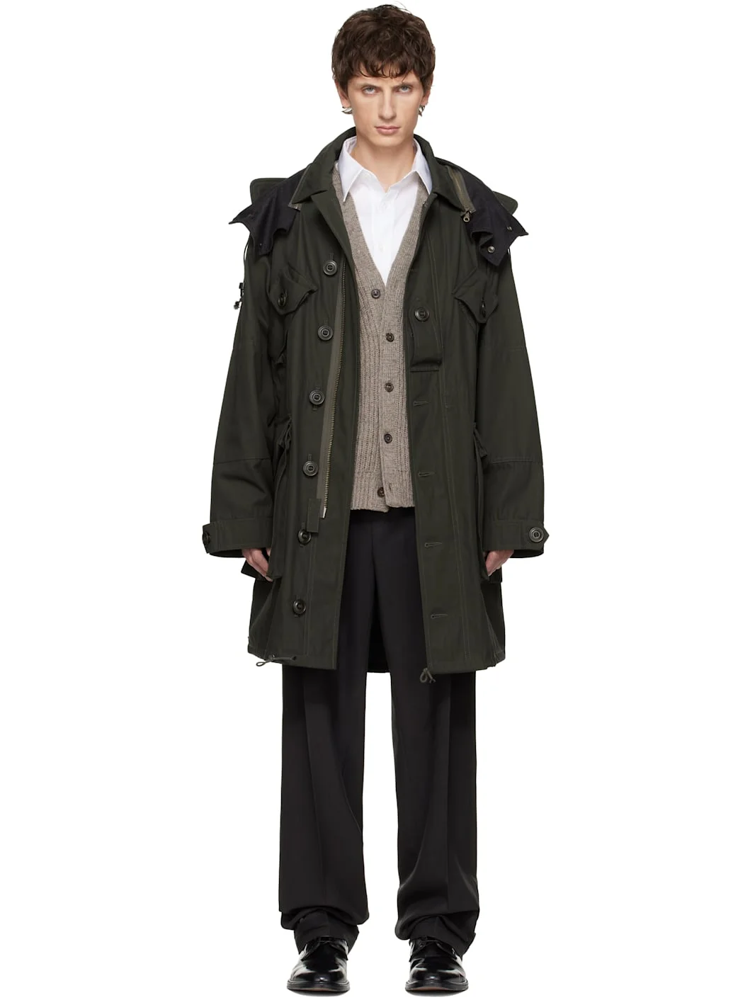 Cotton twill jacket. · Detachable virgin wool twill-lined hood · Spread collar · Concealed zip closure with button placket · Bellows pockets at front · Concealed drawstring at waist and hem · Button fastening at cuffs · White stitching at back · Patch pocket at interior · Twill lining Supplier color: Olive Body 1: 50% cotton, 50% polyester. Body 2: 100% virgin wool. Lining: 65% polyester, 35% cotton. Made in Italy 252168M176000