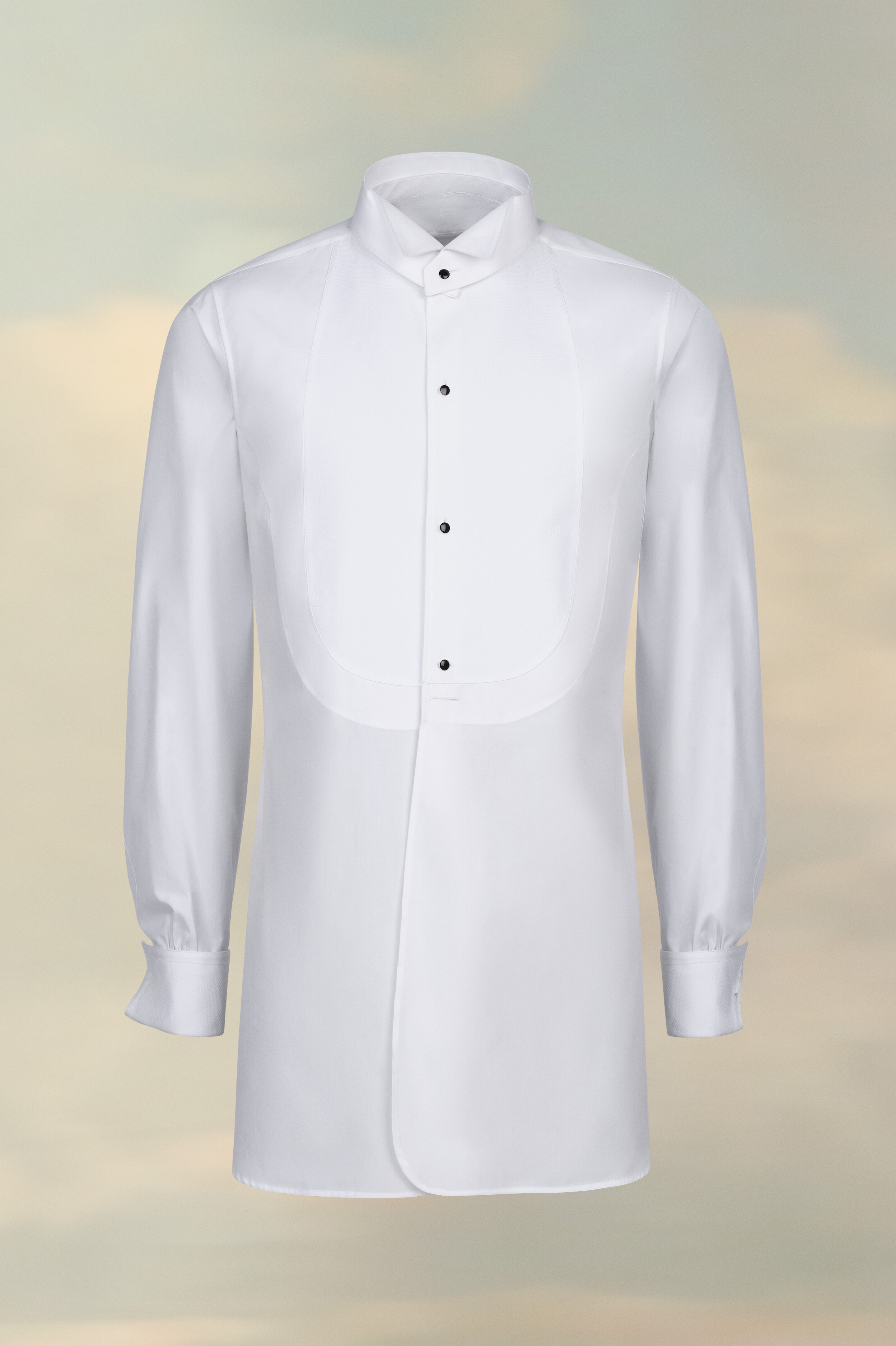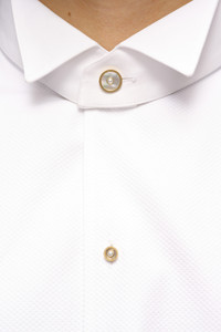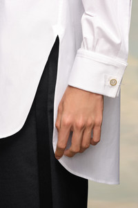 Crafted in cotton poplin, this dress shirt has long sleeves with fitted cuffs and a wing collar. The hem is curved and split at the sides. Four contrast buttons run down half of the design with a button and loop at the back. The model is 188cm tall. Model wears size 39.