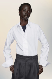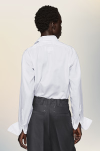 This cotton shirt plays with proportion, cutting a clean silhouette from classic elements: sharp collar, oversized cuffs, and a curved hem. Familiar components, restructured. At the back, the Maison’s signature four stitches appear; the opposite of a label. Product Details Item ID S29DT0006M35308100 Primary Fabric: 100% Cotton Long-sleeved cotton shirt Pointed collar Front button fastening Oversized cuffs with button closure Curved, pointed front hem Straight back hem Made in Italy