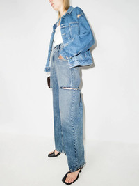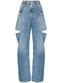 distressed straight-leg jeans Maison Margiela's may look relatively tame but they're anything but basic. A little baggy, they have a straight-leg shape and are slashed at the sides to reveal a little skin. Oo er. Highlights - Blue - Cotton - Cut-out detailing - High waist - Belt loops - Front button and zip fastening - Straight leg - Classic five pockets Made in Italy Composition Cotton 100% SIZE & FIT Model measurements Height 5 ft 10 in(1.77 m) Bust/Chest 34.64 in(88 cm) Hips 35.43 in(90 cm) Waist 26.37 in(67 cm) Measurement FRONT RISE 13.38 in(34 cm) HIPS 38.58 in(98 cm) WAIST 25.98 in(66 cm) Washing instructions Hand Wash
