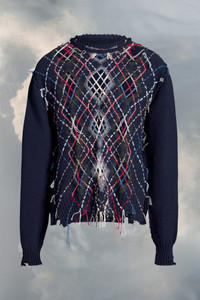 The handcrafted sleeveless crew-neck knit sweater comes in a cut-out argyle pattern with Décortiqué design, destroyed details and loose threads. It features side slits and ribbed trims. Maison Margiela’s signature, the Four stitches, appear at the back; the opposite of a label. Gauge 5. Product Details Item ID S67HL0001S18327001F COED Fall Winter 2023 Composition: 85% Wool 7% Alpaca, 6% Acrylic, 2% Polyamide Crew neck Cut out argyle pattern Handcrafted Destroyed details Ribbed trims Side slits Four stitches at the back Gauge 5