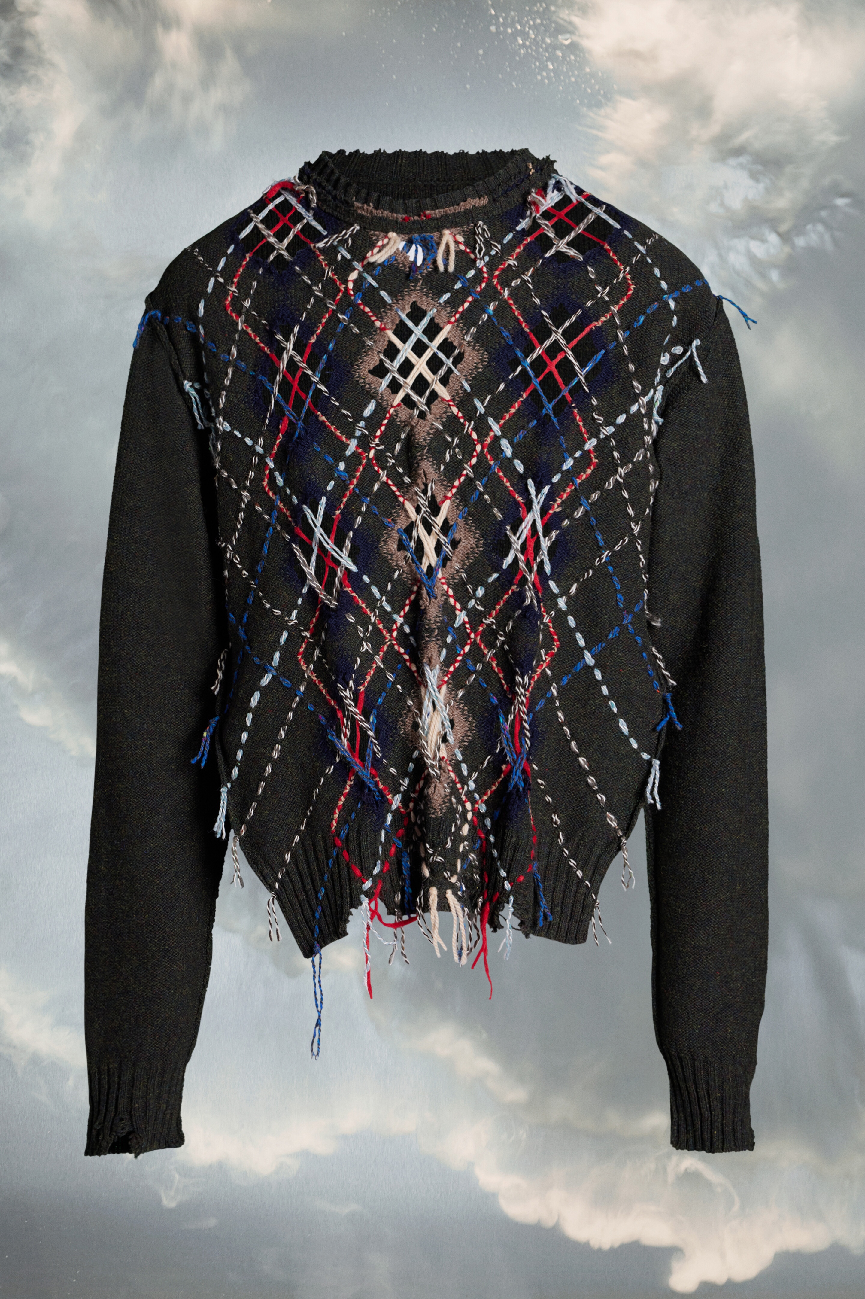 The handcrafted sleeveless crew-neck knit sweater comes in a cut-out argyle pattern with Décortiqué design, destroyed details and loose threads. It features side slits and ribbed trims. Maison Margiela’s signature, the Four stitches, appear at the back; the opposite of a label. Gauge 5. Product Details Item ID S67HL0001S18327002F COED Fall Winter 2023 Composition: 85% Wool 7% Alpaca, 6% Acrylic, 2% Polyamide Crew neck Cut out argyle pattern Handcrafted Destroyed details Ribbed trims Side slits Four stitches at the back Gauge 5 Model is 6'2" tall and wears a size S.