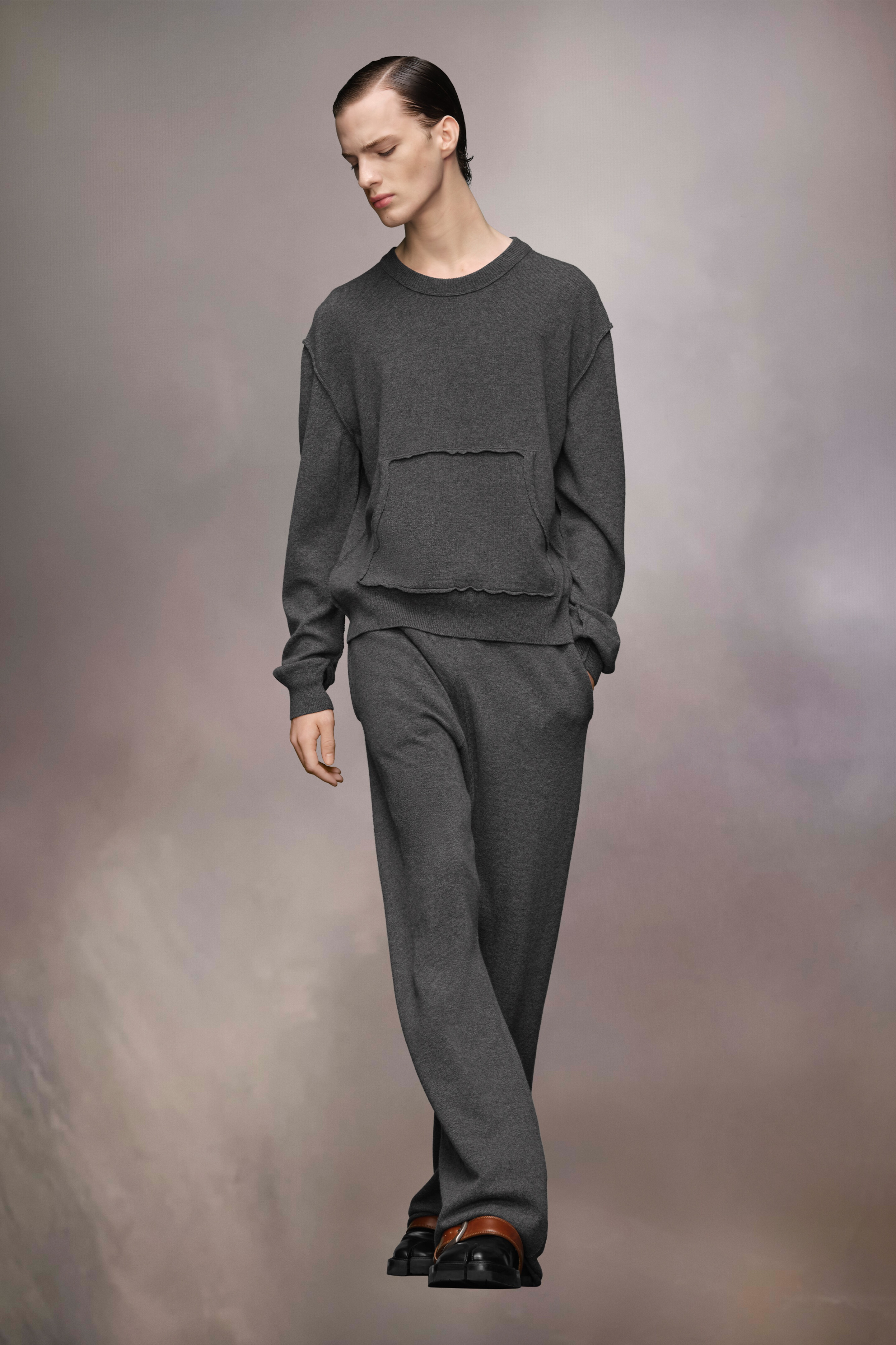 The sweater comes in a cashmere wool blend with ribbed trims. The kangaroo pocket features the Maison's Decortique technique with exposed seams. Maison Margiela's signature, the Four stitches, appear at the back; the opposite of a label. Gauge 12. Product Details Item ID S50HL0027M13060854M Composition: 70% wool, 30% cashmere Midweight wool cashmere blend crewneck Gauge 12 Exposed seams Decortique kangaroo pocket Ribbed trims Four stitches at the back Model is 6'2" tall and wears a size S.