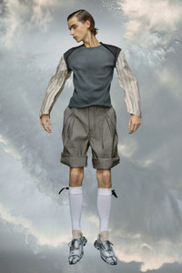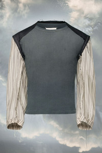 The top features Décortiqué sleeves, lending a makeshift impression inspired by impoverished aristocrats with attitudes. The body has a ribbed finish with Work-in-progress exposed stitch details. Maison Margiela’s signature Four stitches appear at the back; the opposite of a label. Product Details Item ID S67GC0034M20007860 Primary fabric: 100% cotton Lining: 55% viscose-rayon, 45% cotton Sleeve lining: 100% viscose-rayon Fancy rib T-shirt Crewneck Ribbed top Destroyed details Long Décortiqué sleeves Basting stitches Four stitches at the back Made in Italy