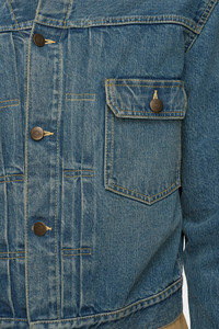 The fitted denim jacket features buttoned chest pockets and exposed stitching with pleat detail to the sides of the buttoned placket. Maison Margiela's signature, the Four stitches, appear at the back; the opposite of a label. Product Details Item ID S50AM0628S30561985 Composition: 100% cotton 14 oz origin denim jacket Button closure Buttoned flap pockets Buttoned cuffs Adjustable waist tabs Four stitches at the back Made in Italy Model is 6'1" tall and wears a size 46.