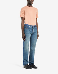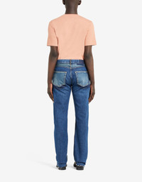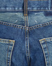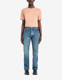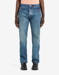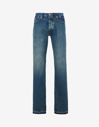 Item details 100% Cotton Denim Solid color Medium wash Mid Rise Button closing Straight-leg model Five pockets Raw-cut hem