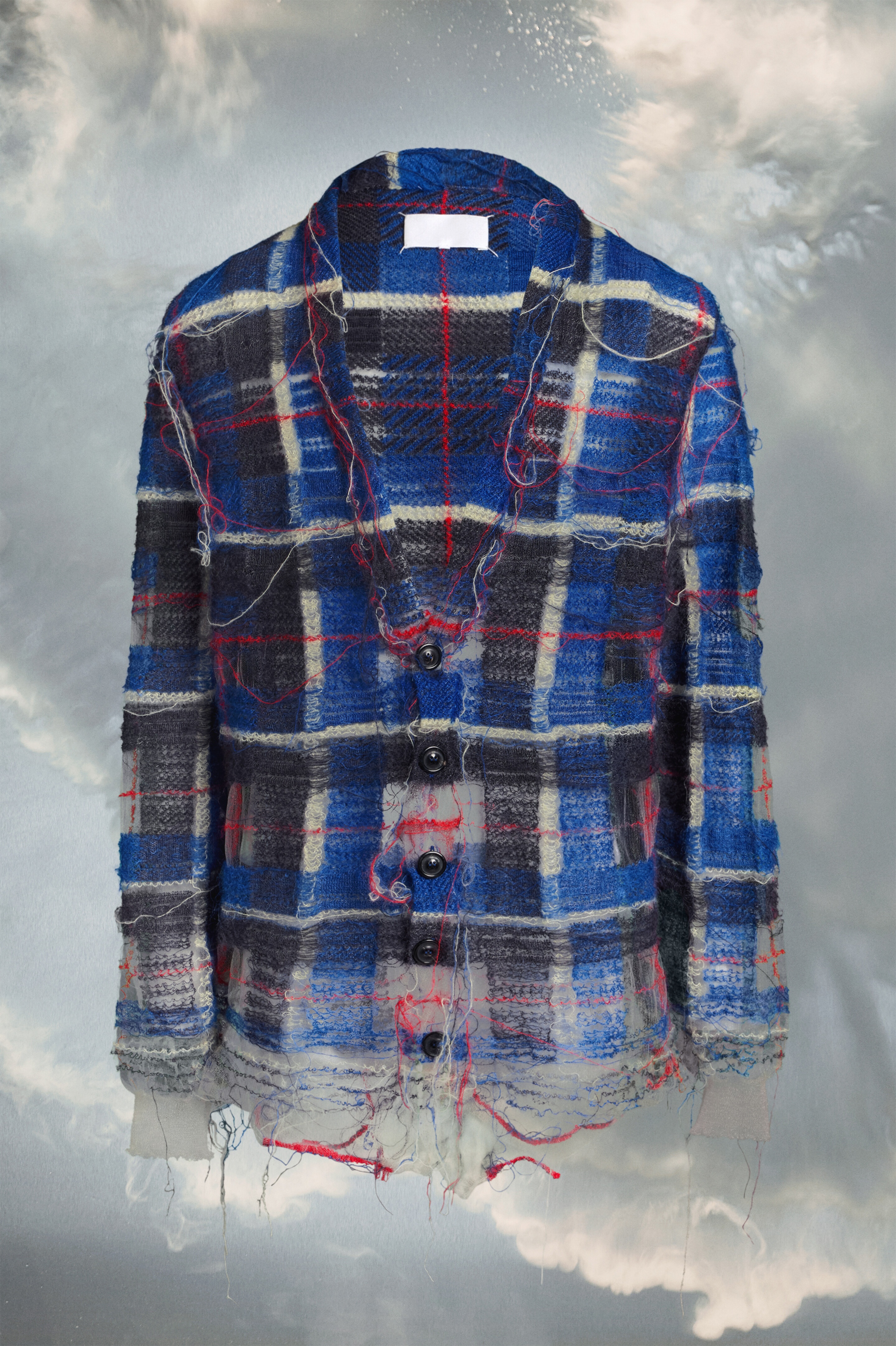 The V-neck cardigan comes in mohair and wool with a transparent nylon base, featuring distressed threads for an undone aesthetic. It is crafted from featherlight check intarsia knits with the reverse side of the knit exposed. Maison Margiela’s signature, the Four stitches, appear at the back; the opposite of a label. Product Details Item ID S67HP0001S18322001F COED Fall Winter 2023 Composition: 58% Mohair wool, 38% Polyamide, 4% Wool V-neck Horn button closure Transparent nylon base Featherlight check intarsia knits Reverse side of the knit exposed Yarns revealed Four stitches at the back Made in Italy Model is 6'2" tall and wears a size S.
