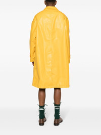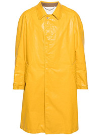 distressed long trench coat Highlights - Mustard yellow - Faux leather - Distressed effect - Classic collar - Long raglan sleeves - Faux belted cuffs - Internal ribbed cuffs - Two front welt pockets - American rear vent - Cotton lining - Spare buttons - Front button fastening Made in Italy Composition Polyurethane 100%, Cotton 96%, Elastane 4% Lining: Cotton 100% SIZE & FIT Model measurements Height 6 ft 2 in(1.88 m) Bust/Chest 35.03 in(89 cm) Hips 35.82 in(91 cm) Waist 27.95 in(71 cm) FittingInformation Designed to be unstructured, offering a loose fit throughout The vented hem offers movement at the rear Made from a midweight fabric This piece fits true to size – take your usual size Washing instructions Dry Clean Only