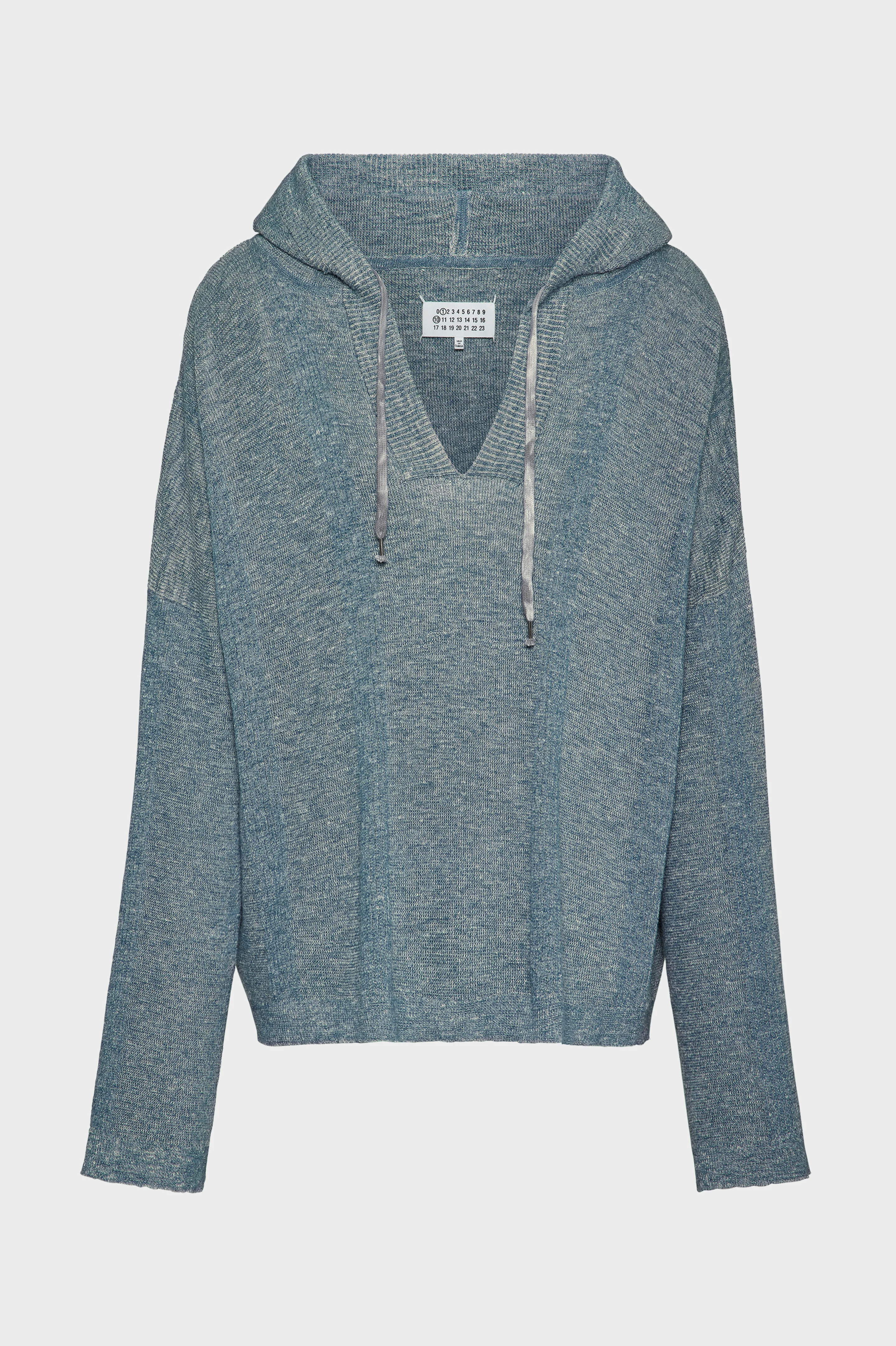 Designed with a delicate chine colouration, finished with a subtle stripe effect, the knitted sweatshirt is crafted from a linen-cotton blend. It has a relaxed fit and low V-neck, with ribbed trims, extra-long sleeves and a long-line silhouette. The drawstring around the neck is reminiscent of used laces. Maison Margiela's signature, the four stitches, appear at the back; the opposite of a label. Product Details Item ID S50GU0226M13097529F Primary Fabric: 40% Linen 30% Polyester 30% Cotton Linen poly hooded sweatshirt with drawstrings Dropped shoulder Ribbed trims Four stitches at the back Model is 185 cm tall and wears a size S.