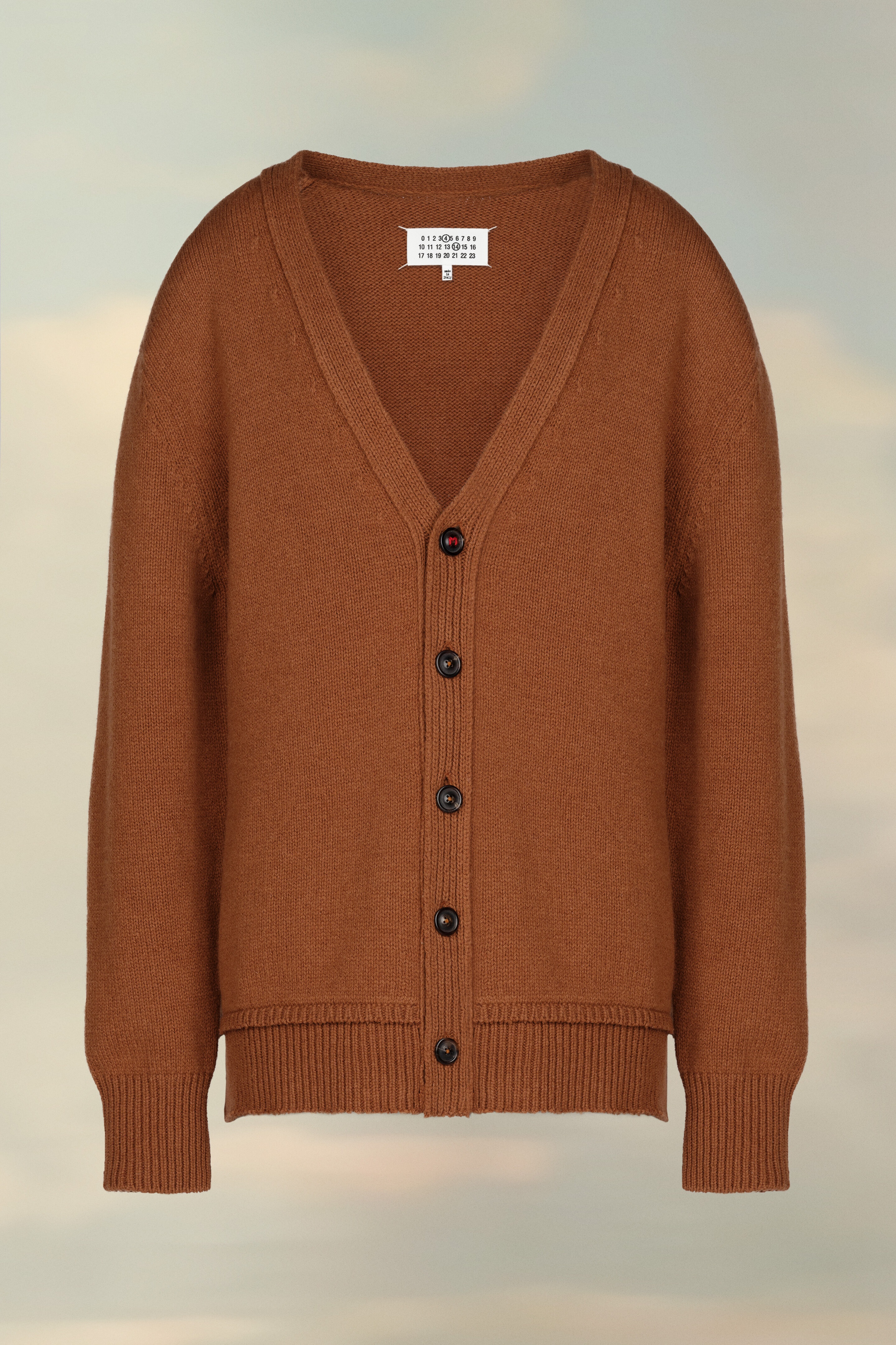 This low V-neck knit cardigan with long sleeves and ribbed trims features tonal elbow patches. At the back, four white stitches show the hand of the Maison: the opposite of a label. Gauge 5. The model is 185cm tall. Model wears size S.