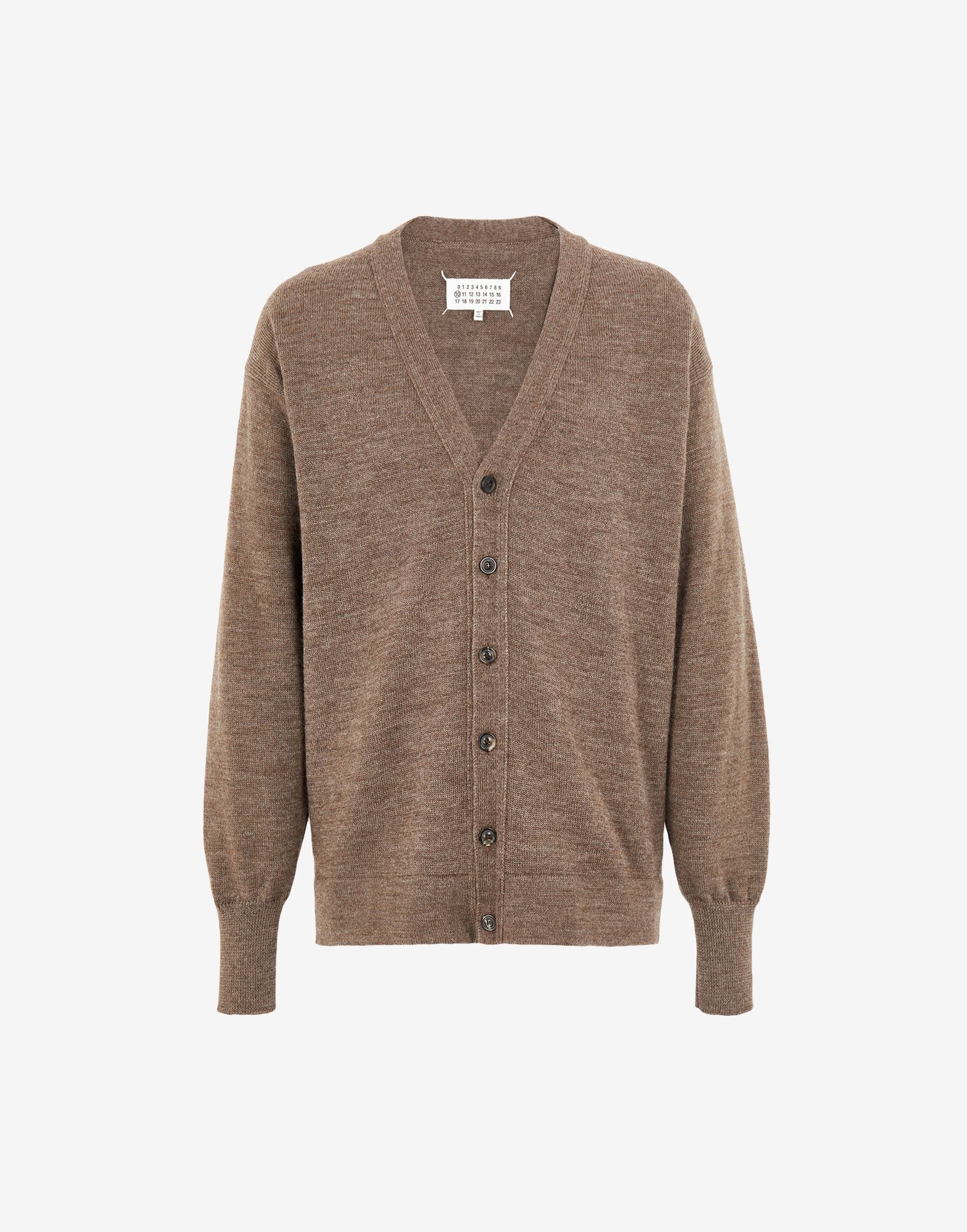 Relaxed-fit cardigan with elbow patches, adorned with the Maison's four-stitches moniker at the back. Gauge 7. Item details 100% Wool Lightweight knit V-neck Solid colour with appliqués Long sleeves Button closing