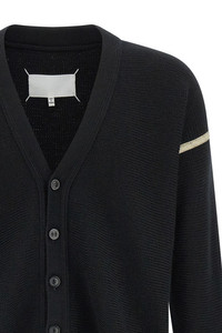 cod. S67HP0035M13182900 Virgin wool cardigan with V-neck, front button closure, long cuffed sleeves, dropped shoulder, contrasting used-effect cotton detail, and stonewashed cotton denim elbow patch. This product has been made with craftsmanship that makes it a unique piece. Slight imperfections and slight differences between one garment and another are, therefore, to be considered normal and a guarantee of craftsmanship of the product. Color: Black Size & Fit: true to size fit Composition: 100% virgin wool Made in: Romania
