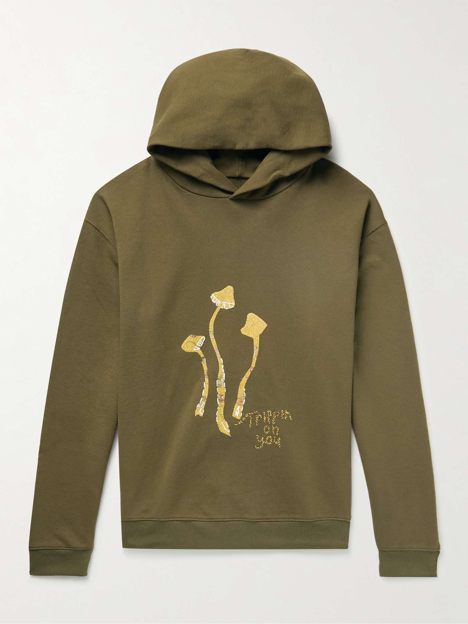 Maison Margiela adds a contemporary flare to wardrobe basics. This hoodie is cut from loopback cotton-jersey in an easily matched hue. Beneath the patchwork mushrooms you'll find the saying, 'Trippin on You'. Size & Fit - Fits true to size. Take your normal size - Take the next size down if you wish to achieve a closer fit - This hoodie is designed for an oversized fit - Mid-weight, slightly stretchy fabric - Model wears a M - Model measures: chest 38"/ 96cm, height 6'2"/ 185cm Details & Care - Army-green cotton-jersey - 100% cotton - Machine wash - Designer colour: Military Olive - This item has been imported