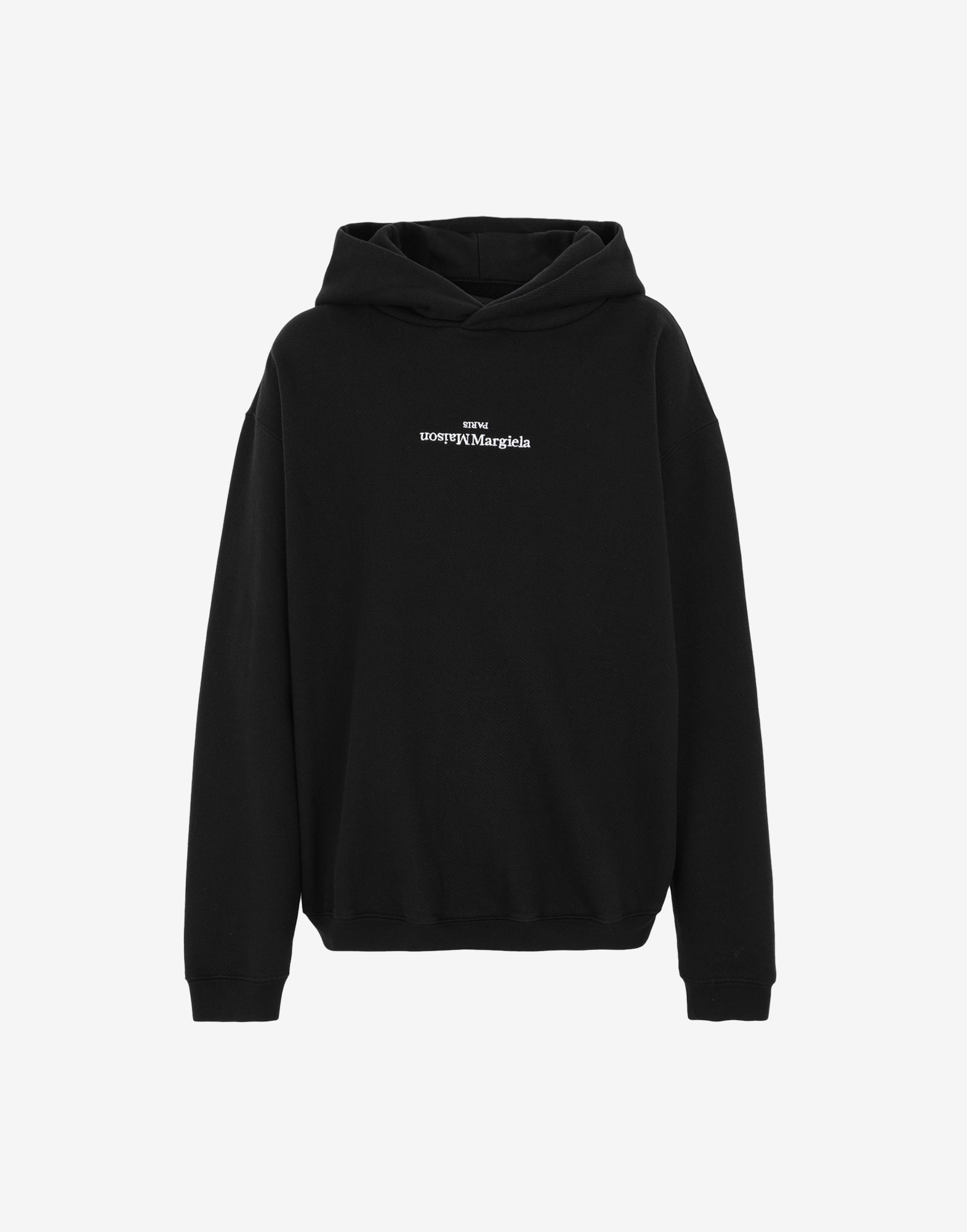 Oversized hooded sweatshirt in cotton with contrast upside down Maison Margiela Paris logo embroidered at the front. It's finished with the white four-stitches moniker at the back. Made in Italy. Item details 100% Cotton Sweatshirt fleece Logo Solid color Hooded collar French Terry lining