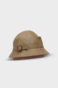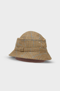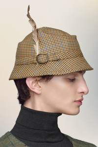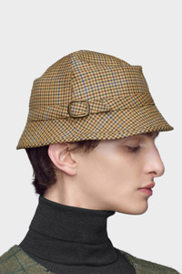 This checked trilby reimagines countryside archetypes with exaggerated details, including a buckled trim and softly structured brim. A reversible grosgrain ribbon reveals the hat’s inner construction, reflecting the Maison’s subversive take on rural tradition. Maison Margiela’s signature, the four stitches, appear at the back; the opposite of a label. The Spiga capsule is a limited release to mark the recent unveiling of the MM6 Maison Margiela store Via della Spiga in Milan. Product Details Item ID S50TC0078M35648001F Primary Fabric: 100% Wool Wool trilby hat with a narrow brim and structured crown Check pattern with buckle and feather detail Reversible grosgrain band reveals internal construction Four stitches at the back Made in Italy