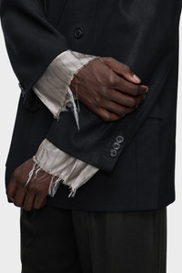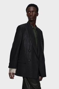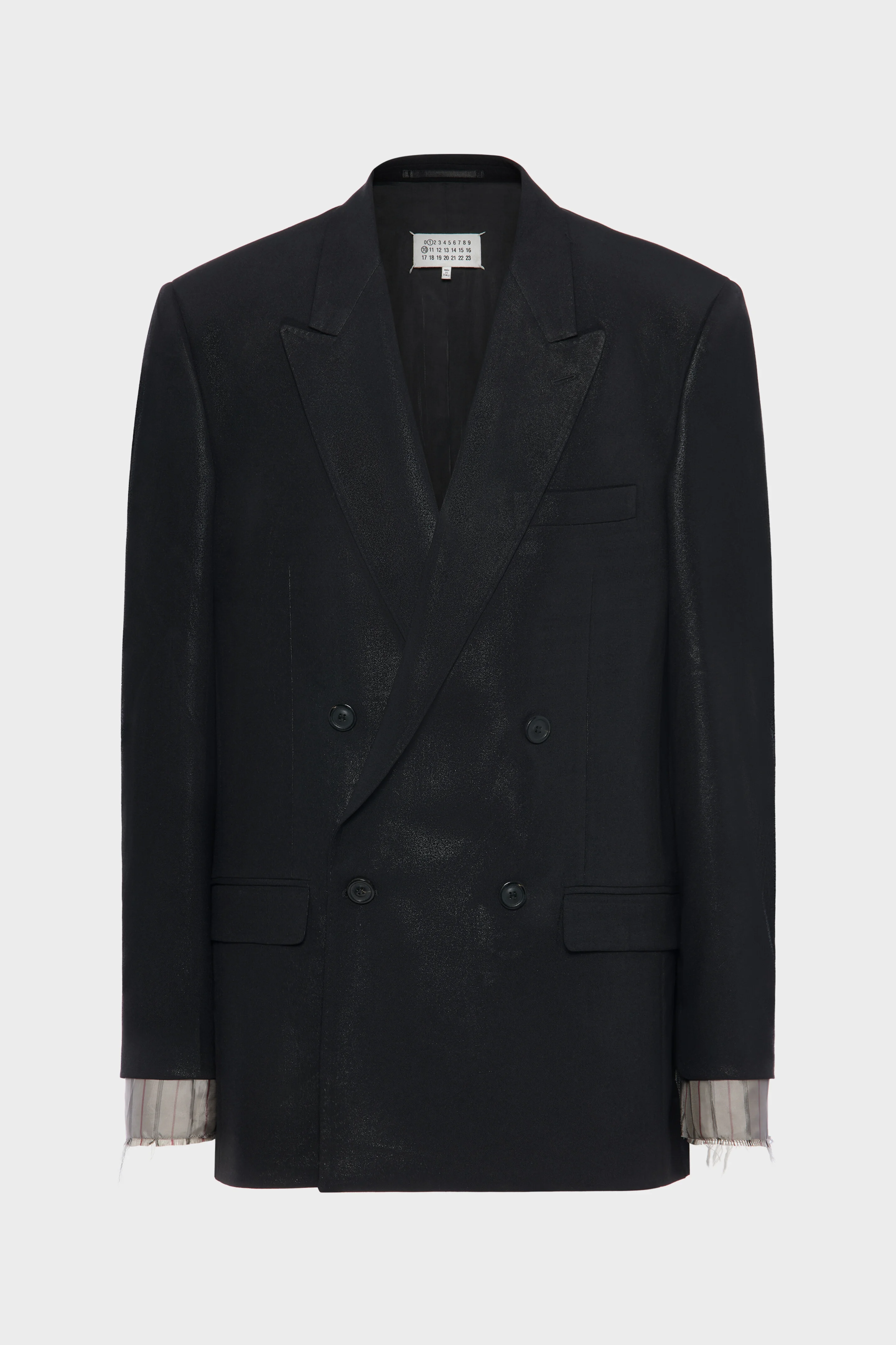 This double-breasted blazer is crafted in virgin wool transformed by the Maison’s pressed and foiled technique. Heat and pressure fuse foil into the surface, imparting a subtle shine that reframes tailoring with tactile depth. Structured shoulders and peak lapels maintain classic codes, while the back reveals the imprint of the lapels, a trace of construction left visible. At the back, the Maison’s signature four stitches appear; the opposite of a label. Product Details Item ID S50BN0548M35745900 Primary fabric: 100% virgin wool Lining: 57% acetate 43% viscose-rayon Pocket lining: 100% cotton Sleeve lining: 100% cupro Tropical wool Double-breasted front with peak lapels Long sleeves Button closure at the front Four stitches at the back Made in Italy